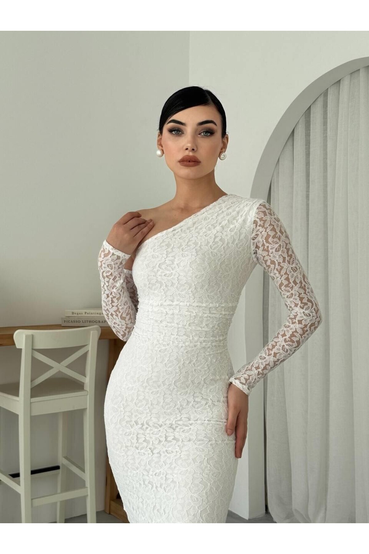 Monapera Bees Tek Omzu Açık Dantel Midi Elbise