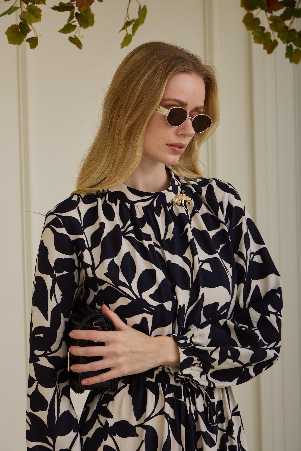 Moodbasic Merve YAPRAK DESENLİ CUPRA KETEN ELBİSE