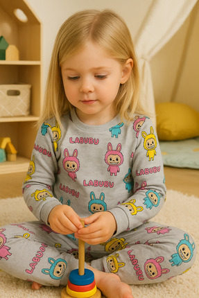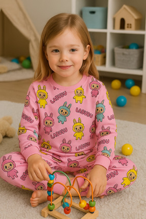 Arya Nisa Kids KIZ ÇOCUK LABUBU KARAKTER BASKILI MEVSİMLİK %100 PAMUKLU PİJAMA TAKIMI