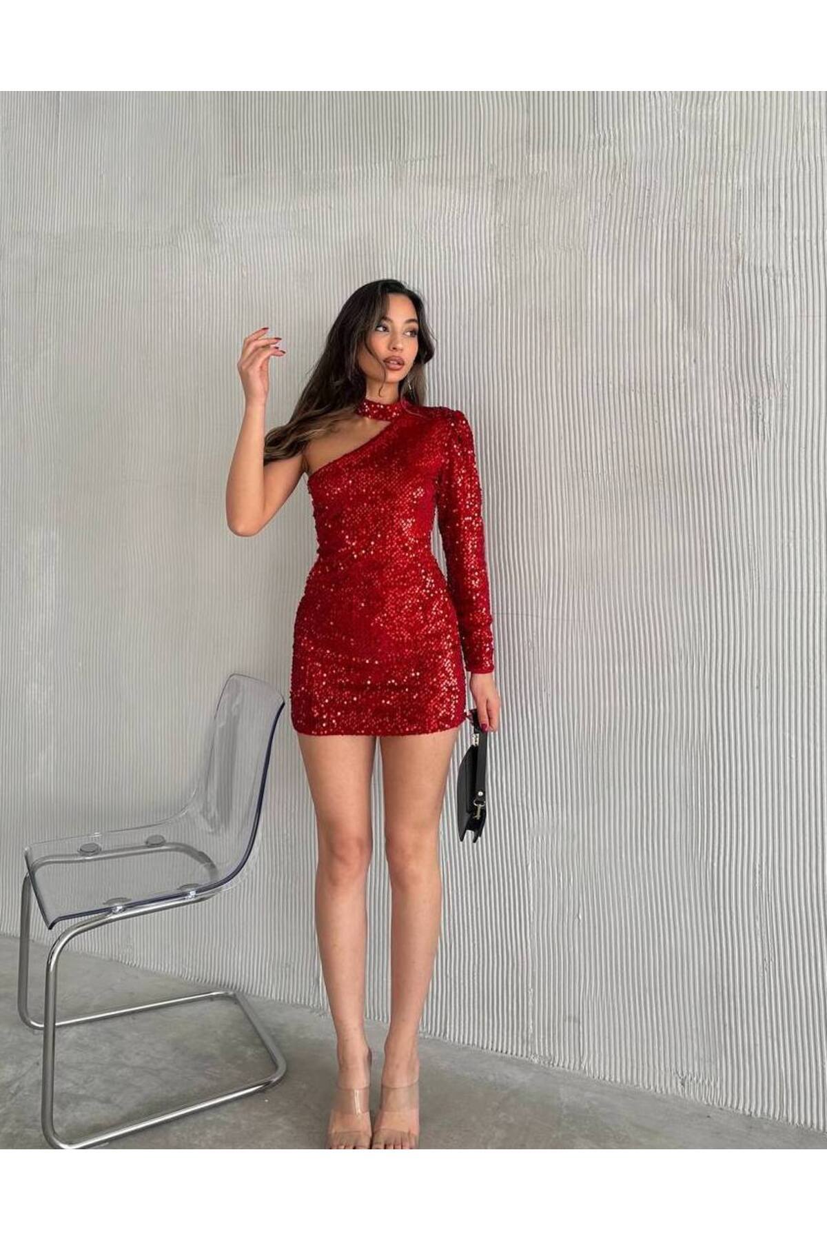 Mostpera Tek Kol Omzu Açık Pul Payet Mini Yılbaşı Elbisesi