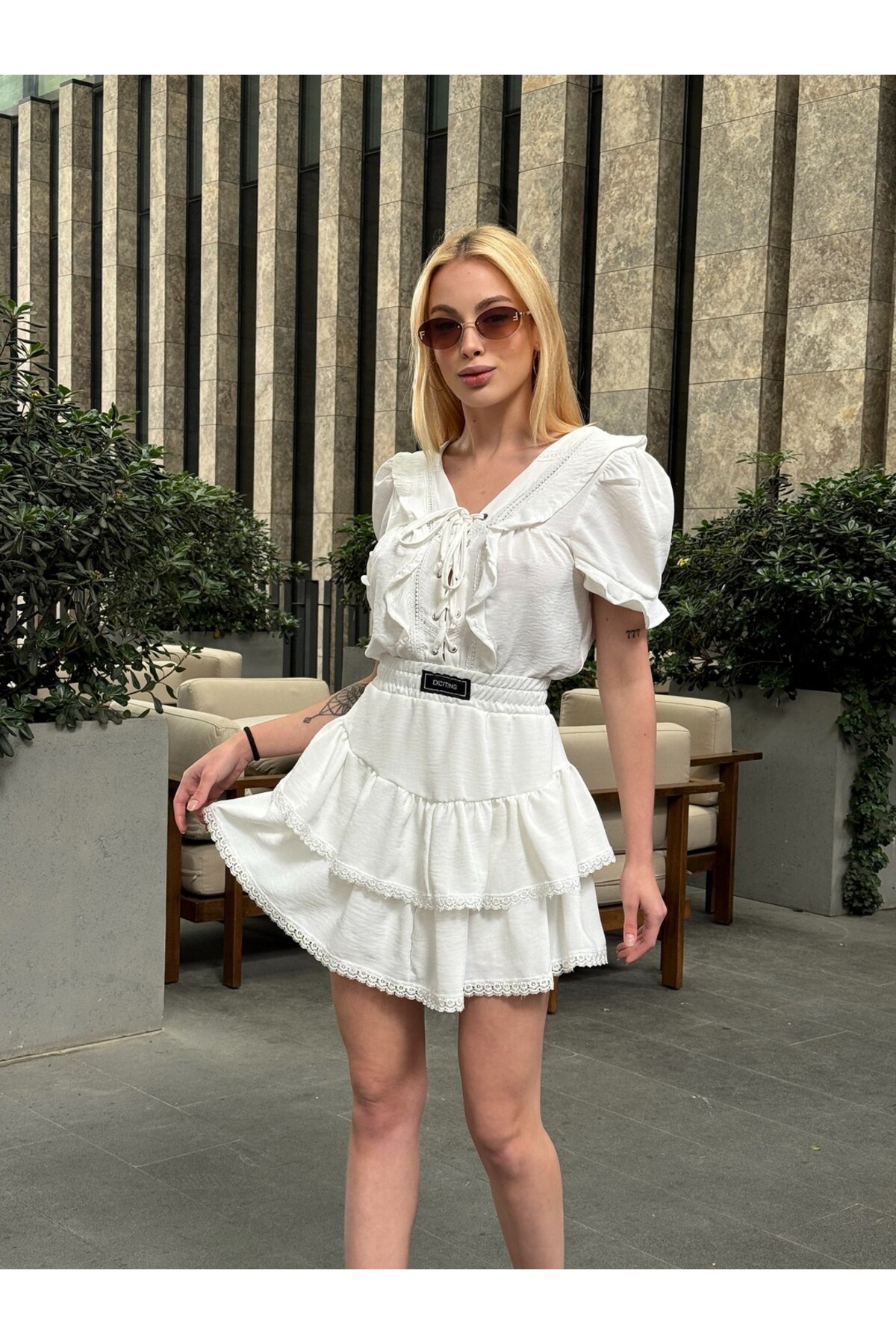 MY DEPO Önü Bağcıklı Fırfırlı Dantel Güpür Detaylı Şortlu Desıng Elbise
