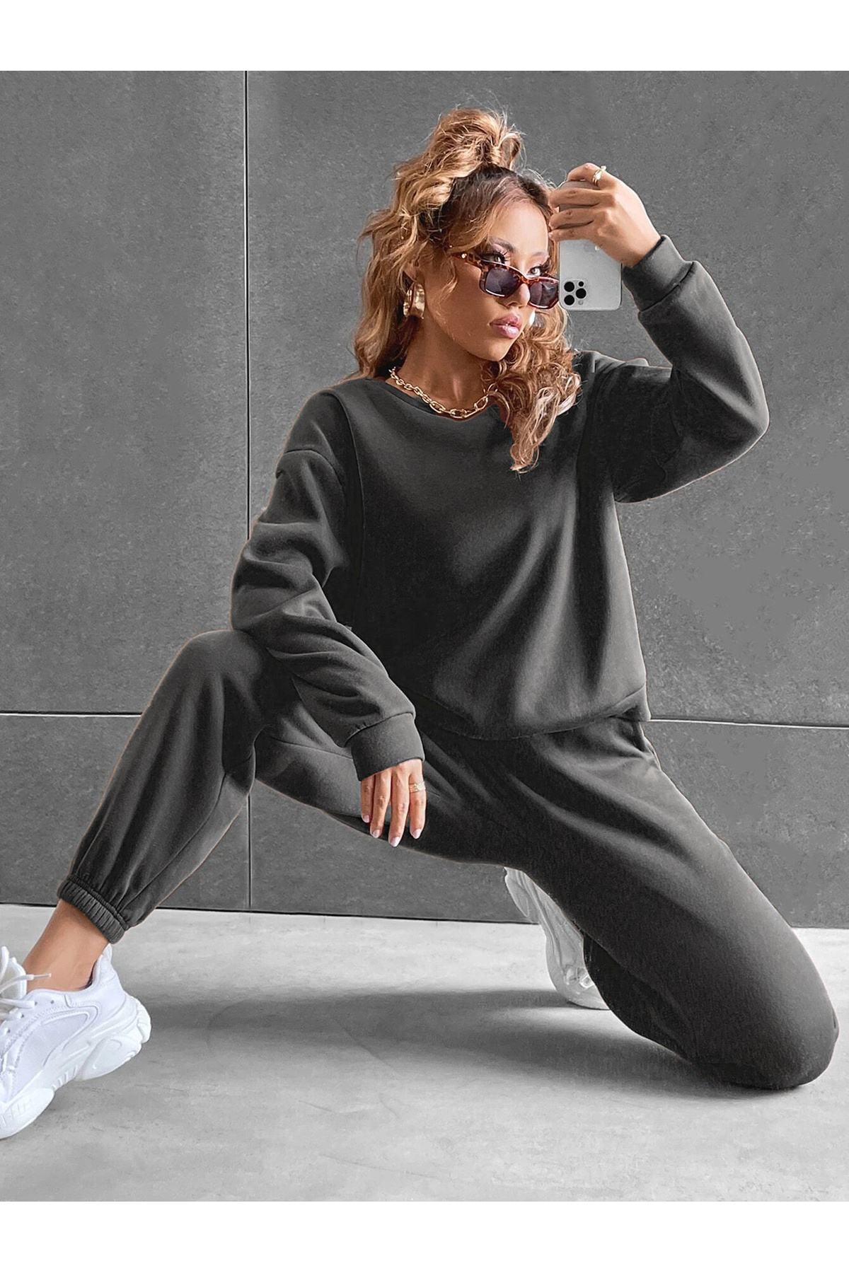 Mythologie Basic Düz Bisiklet Yaka Kombin Alt Üst Eşofman Takımı - Siyah Oversize Lastik Paça Özellikleri