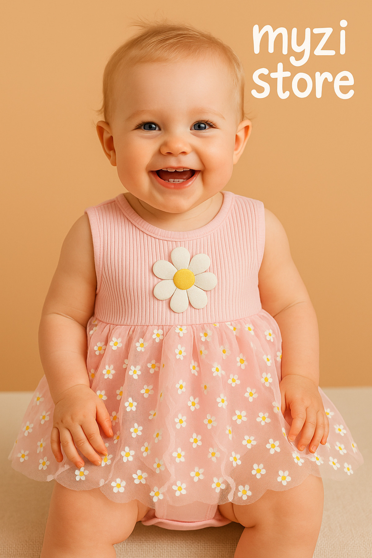 MYZİ STORE Kız Bebek Elbise Tek Parça Yazlık %100 Pamuk Kumaş Tüllü Çiçek Desenli Elbise