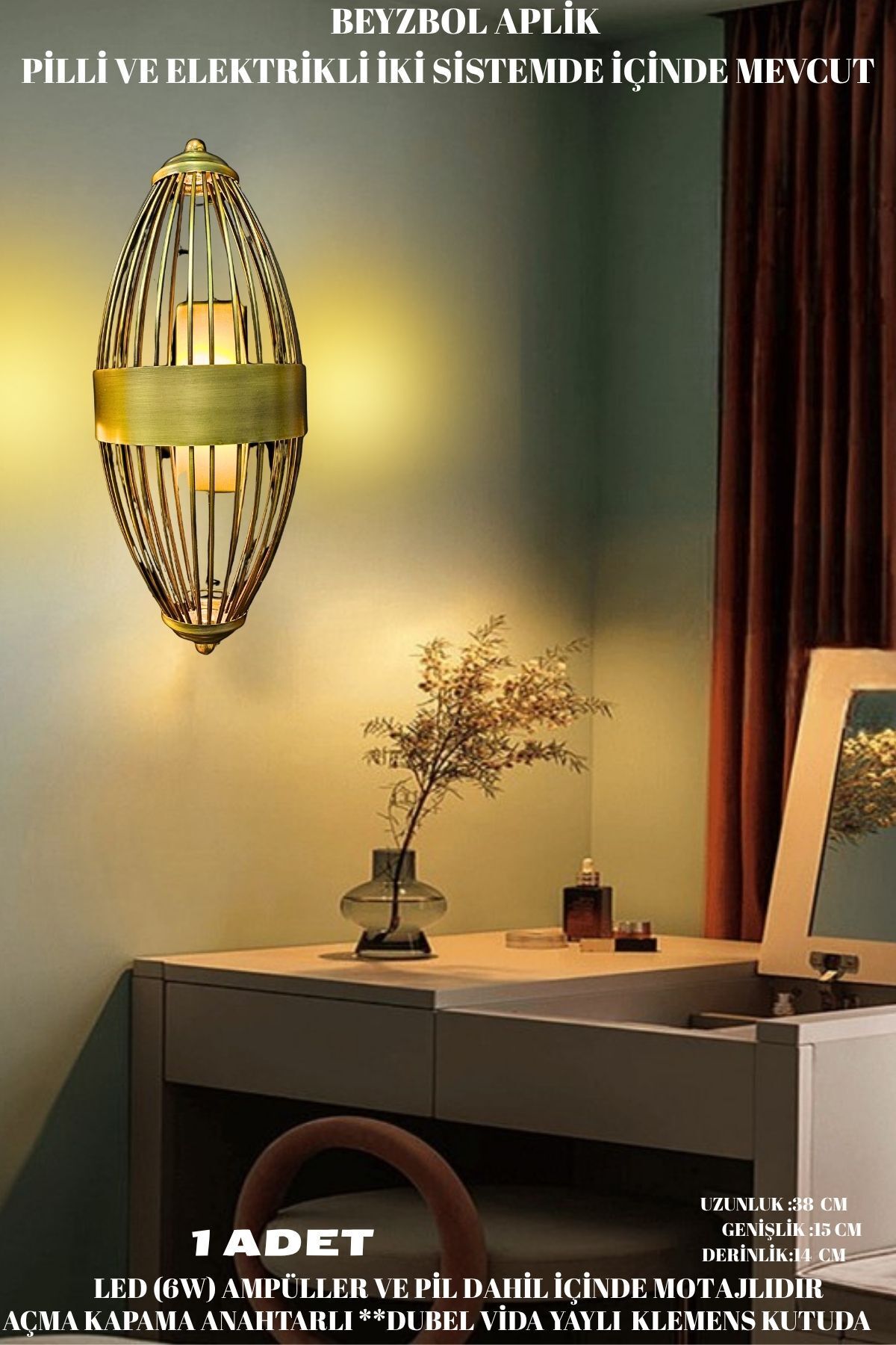 nazarium Beyzbol Aplik Eskitme, Pilli Aplik, Anahtarlı, Pilli Elektrikli Ledli Duvar Aplik,eskitme renk