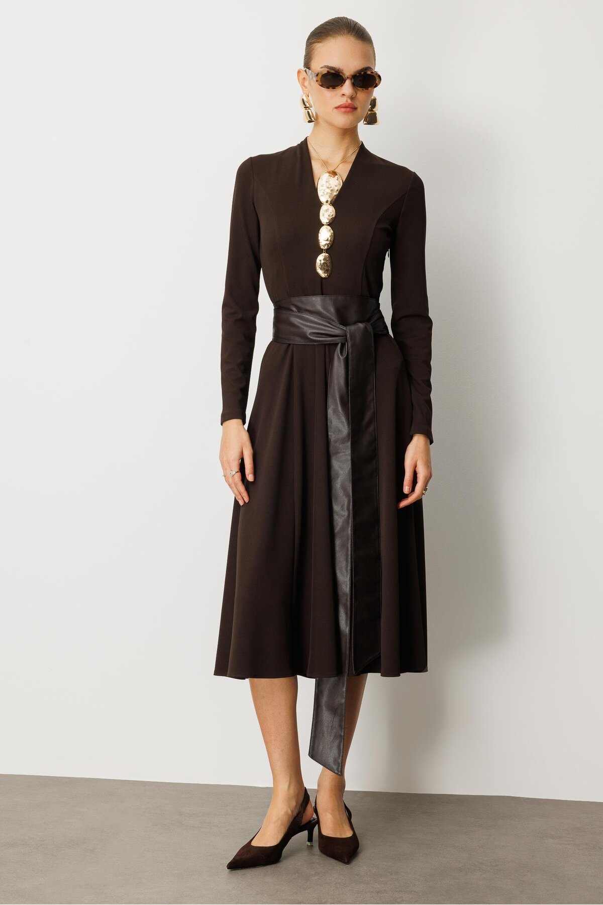 Nefeli Deri Kuşaklı Örme Elbise KAHVE