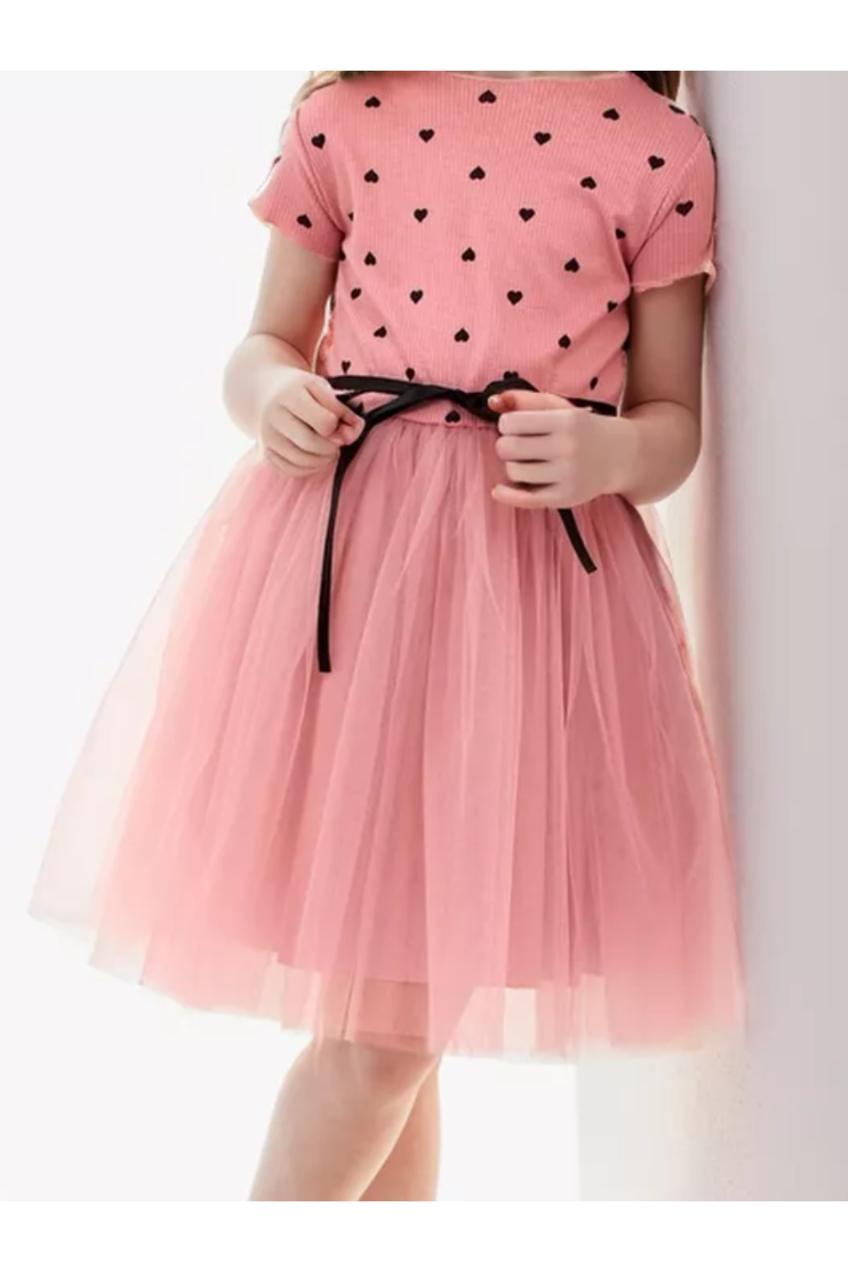 neocotton Kalp Desenli Astarlı Tüllü Pamuklu Esnek Dokuma Çocuk Elbise