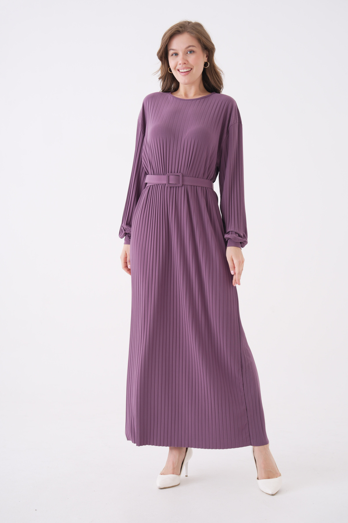 NİSUM MODA KOMPLE PİLİSELİ VE KEMERLİ UZUN ELBİSE