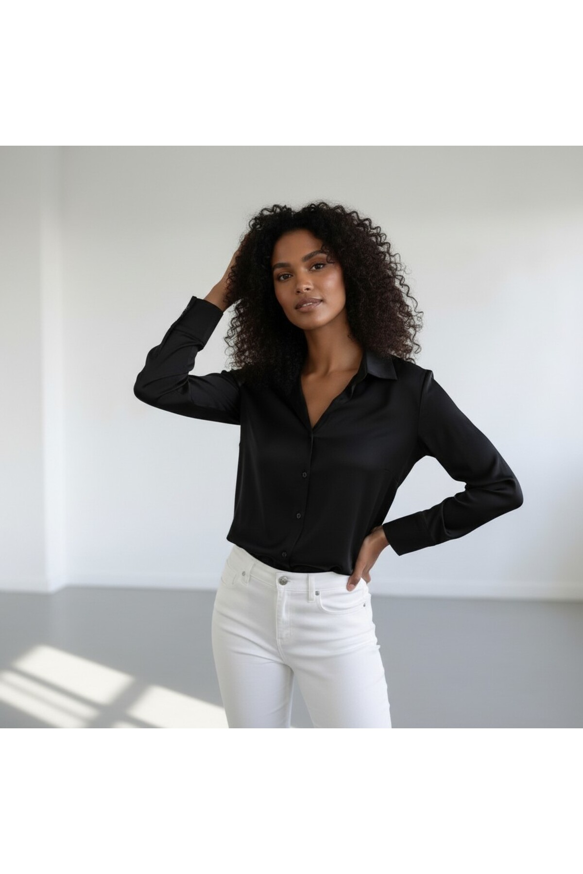 Nostos Algos Siyah Saten Basic Dökümlü Gömlek