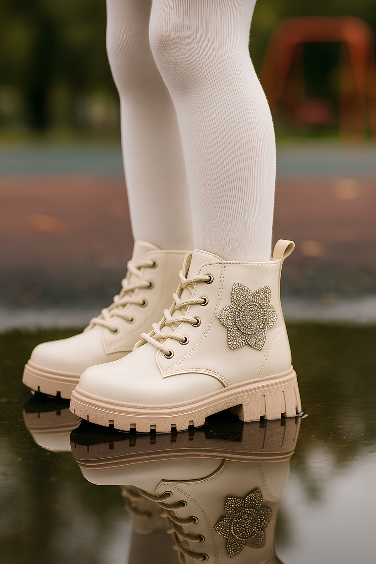 Nstil Günlük Çocuk Bot Bej Rugan Çiçekli Taşlı Bağcıklı Fermuarlı Rugan Kalın Tıtrıklı Taban Bootie 600