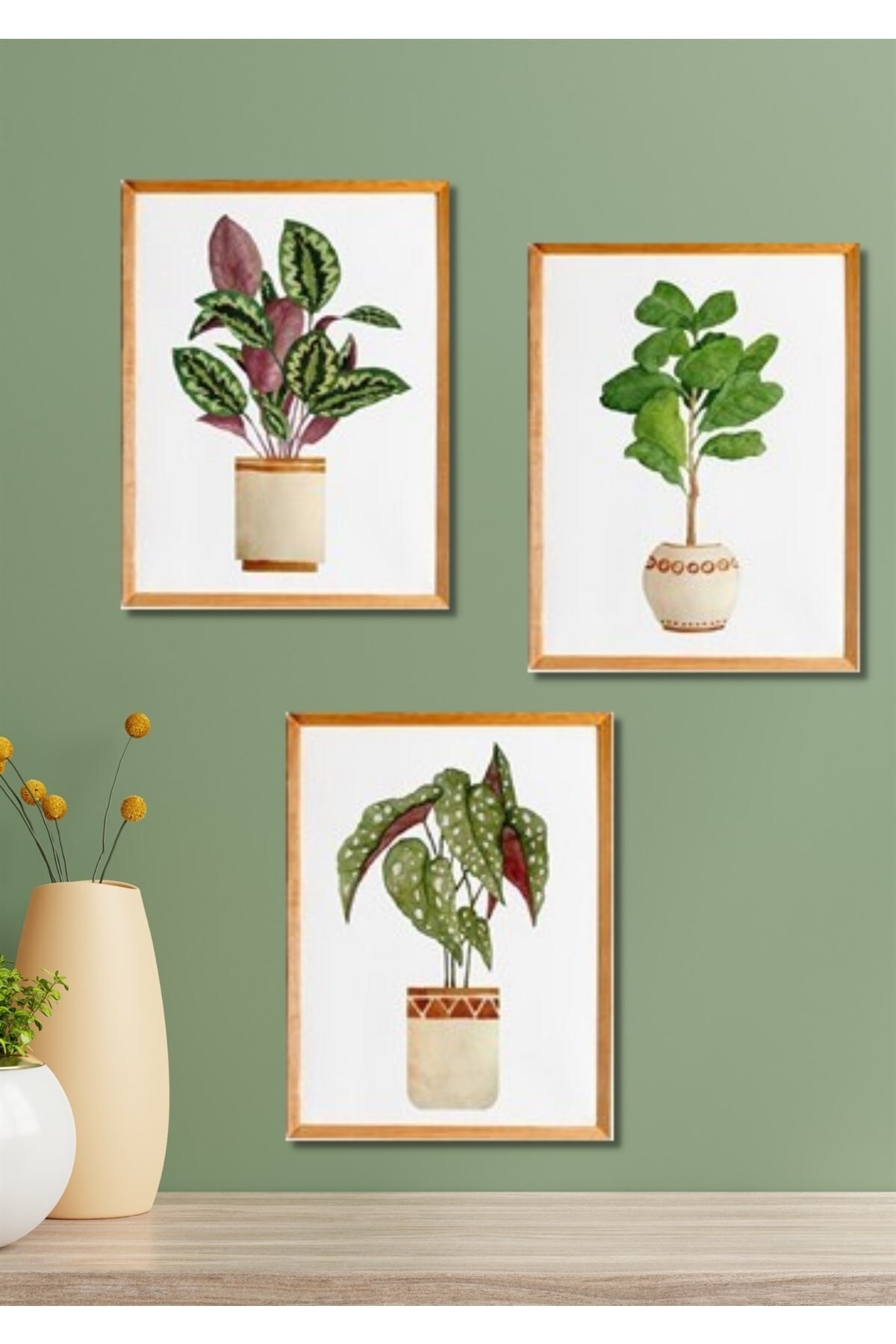 NT Handmade 3 Parça Ahşap Çerçeve Görünümlü Botanic Vase - Salon Yatak Odası Mutfak Için Tablo Seti