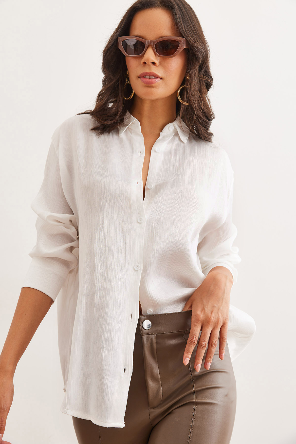 Olalook Kadın Ekru Saten Krinkıl Dokuma Parlak Gömlek GML-19001276 Özellikleri