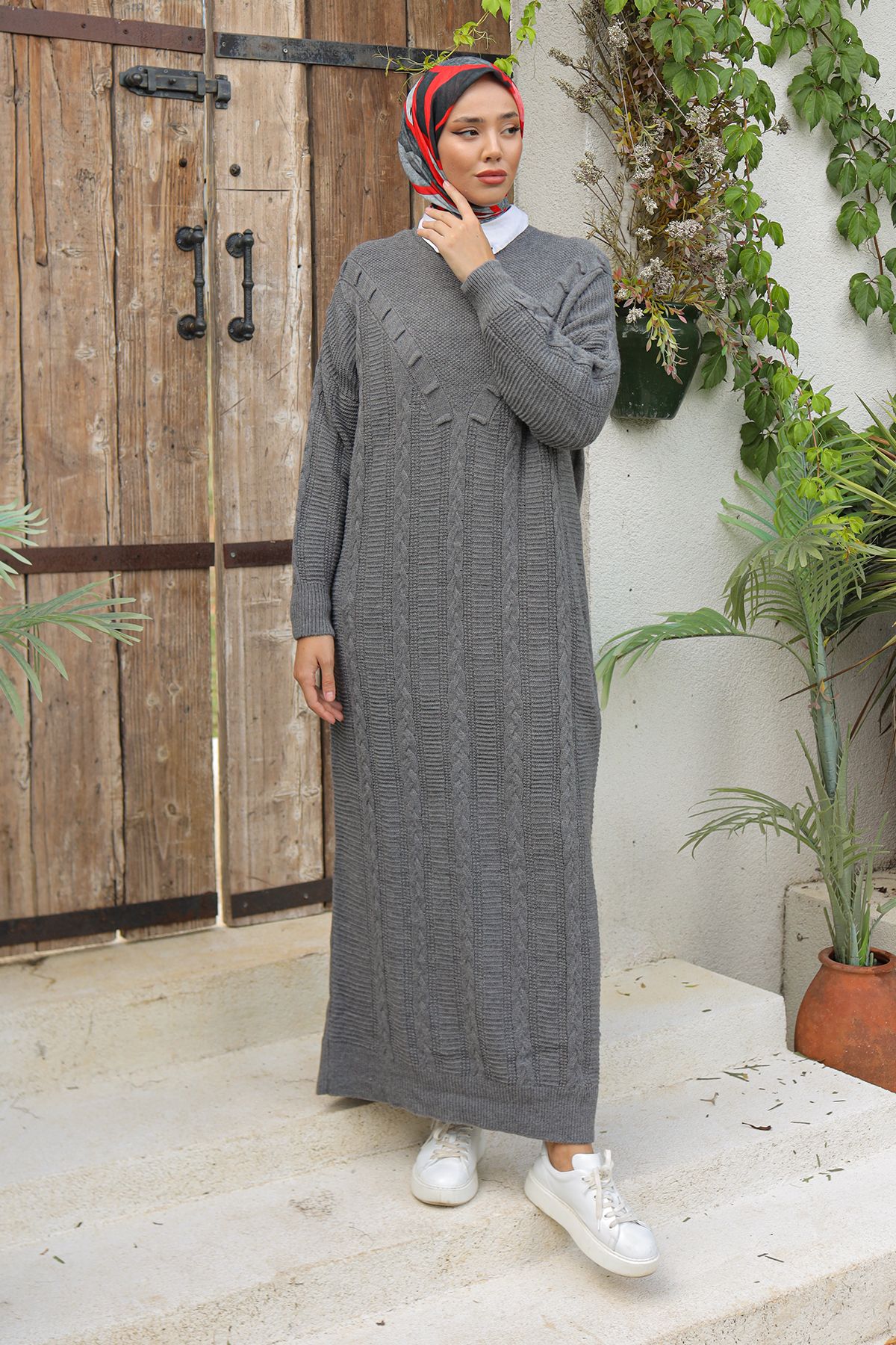 Pamuk Butik Kadın V Detaylı Saç Örgülü Triko Elbise