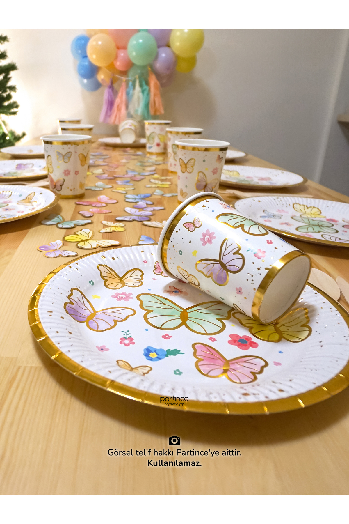 partince 8 Kişilik Makaron Kelebek Tema Kullan At Karton Tabak Bardak Çatal Kaşık Bıçak Yaldızlı Parti Seti Özellikleri