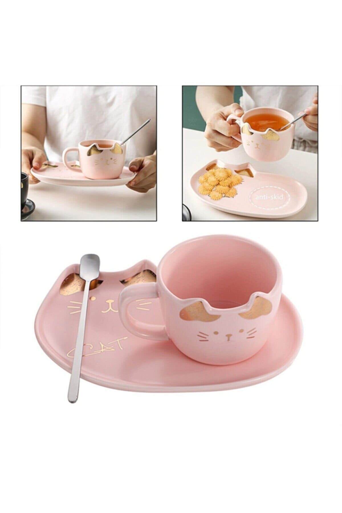 PASİFİK HOME Sunum Tabaklı Kedili Kupa Bardak / Pembe