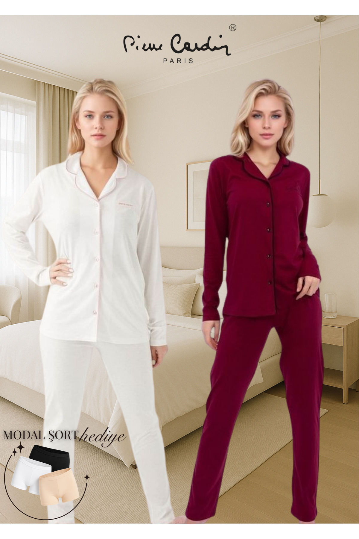 Pierre Cardin Kadın Giyim Pamuklu & Modal Uzun Kol Kutulu 2 Adet Gömlek Pijama Takımı (Modal Şort Hediyeli)