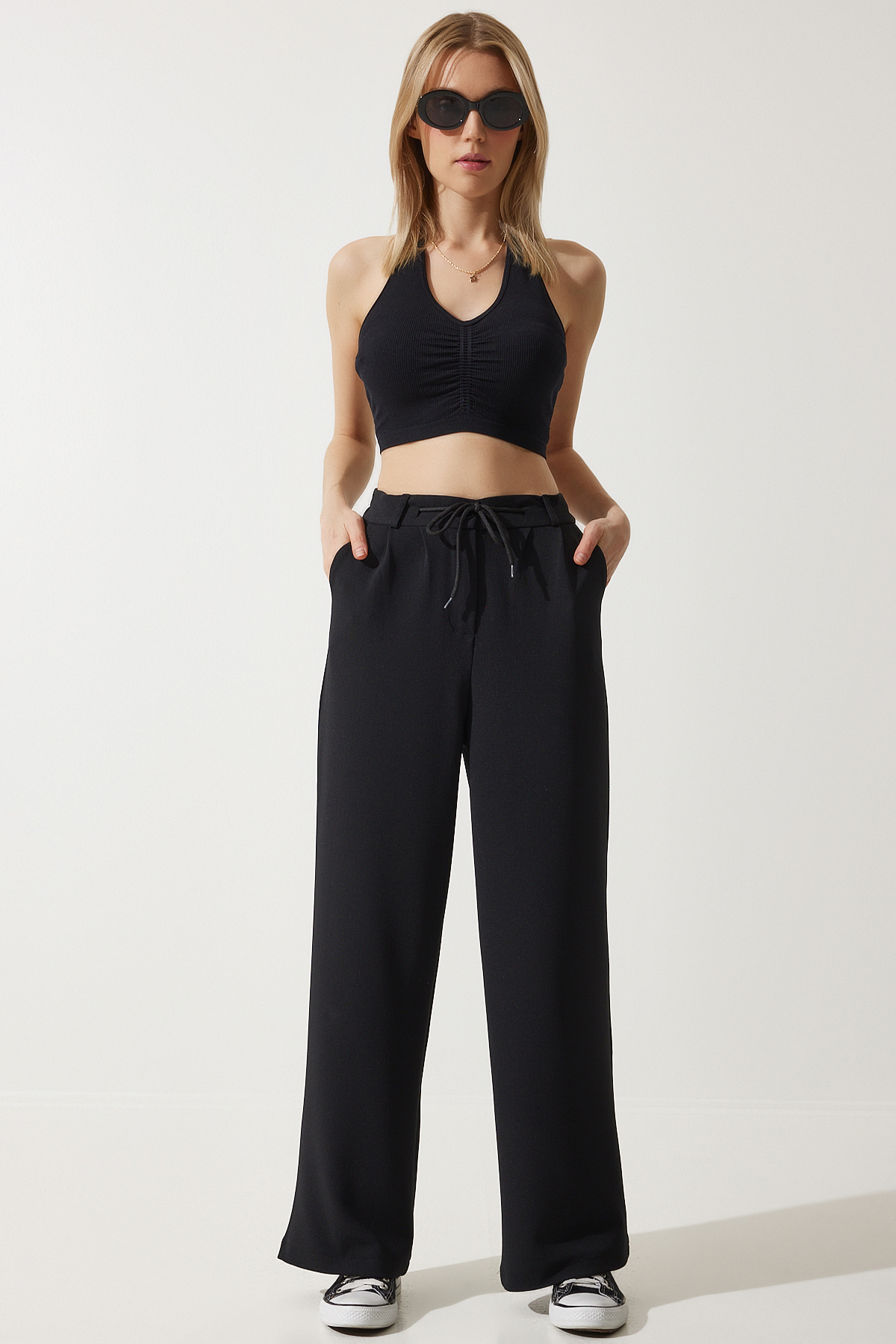 Damskie czarne spodnie dresowe z szeroką nogawką RV00193 Happiness İstanbul – cechy produktów