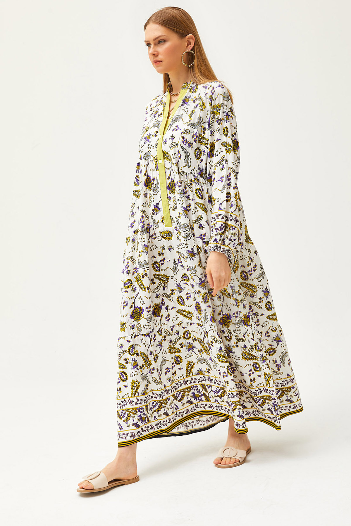 Olalook Damska szalowa, olejowo-zielona kołnierzyka, szczegółowa, luźna sukienka maxi zapinana na guziki ELB-19002057