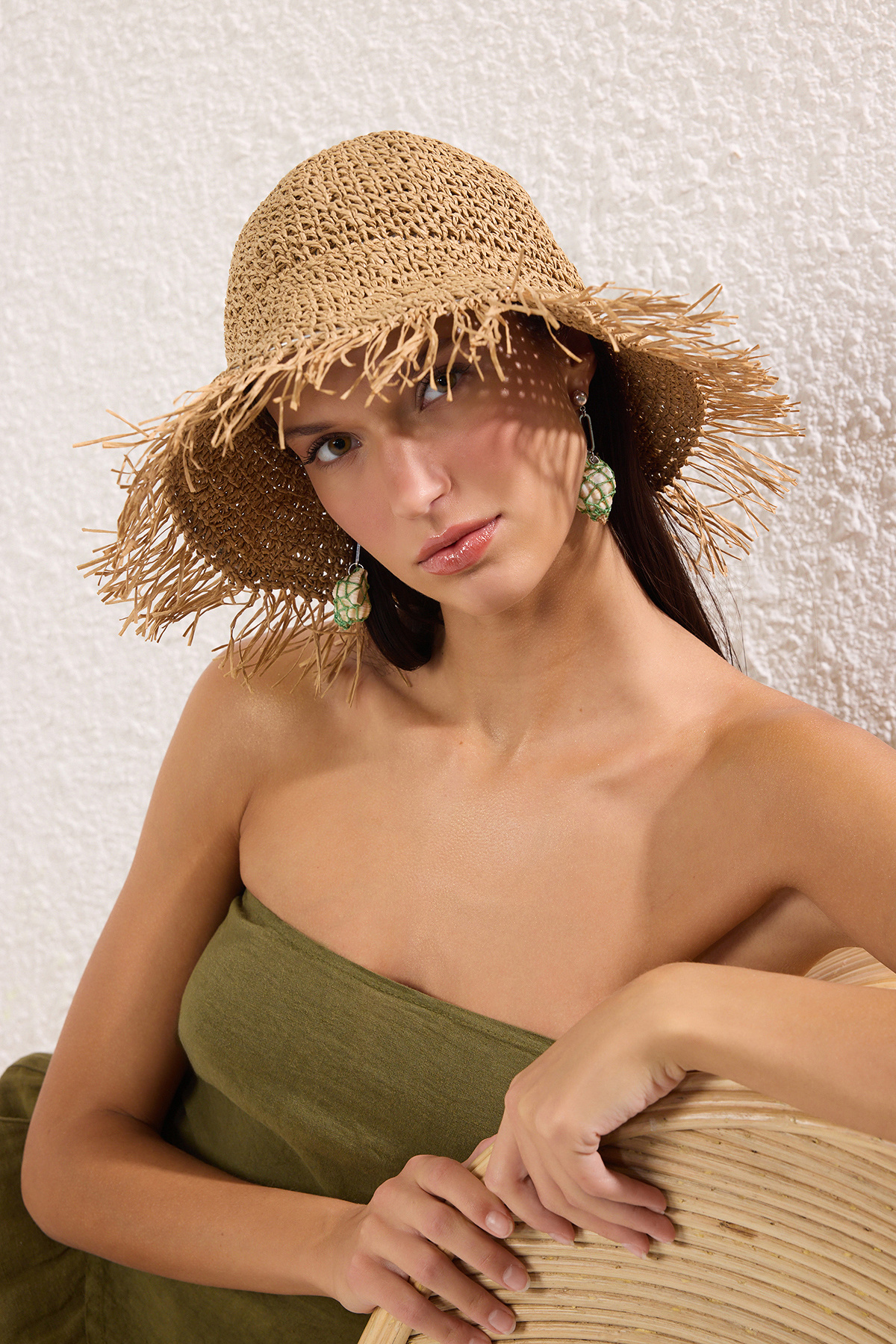 Trendyol Collection Beżowa czapka plażowa z pomponem TBESS25SP00000