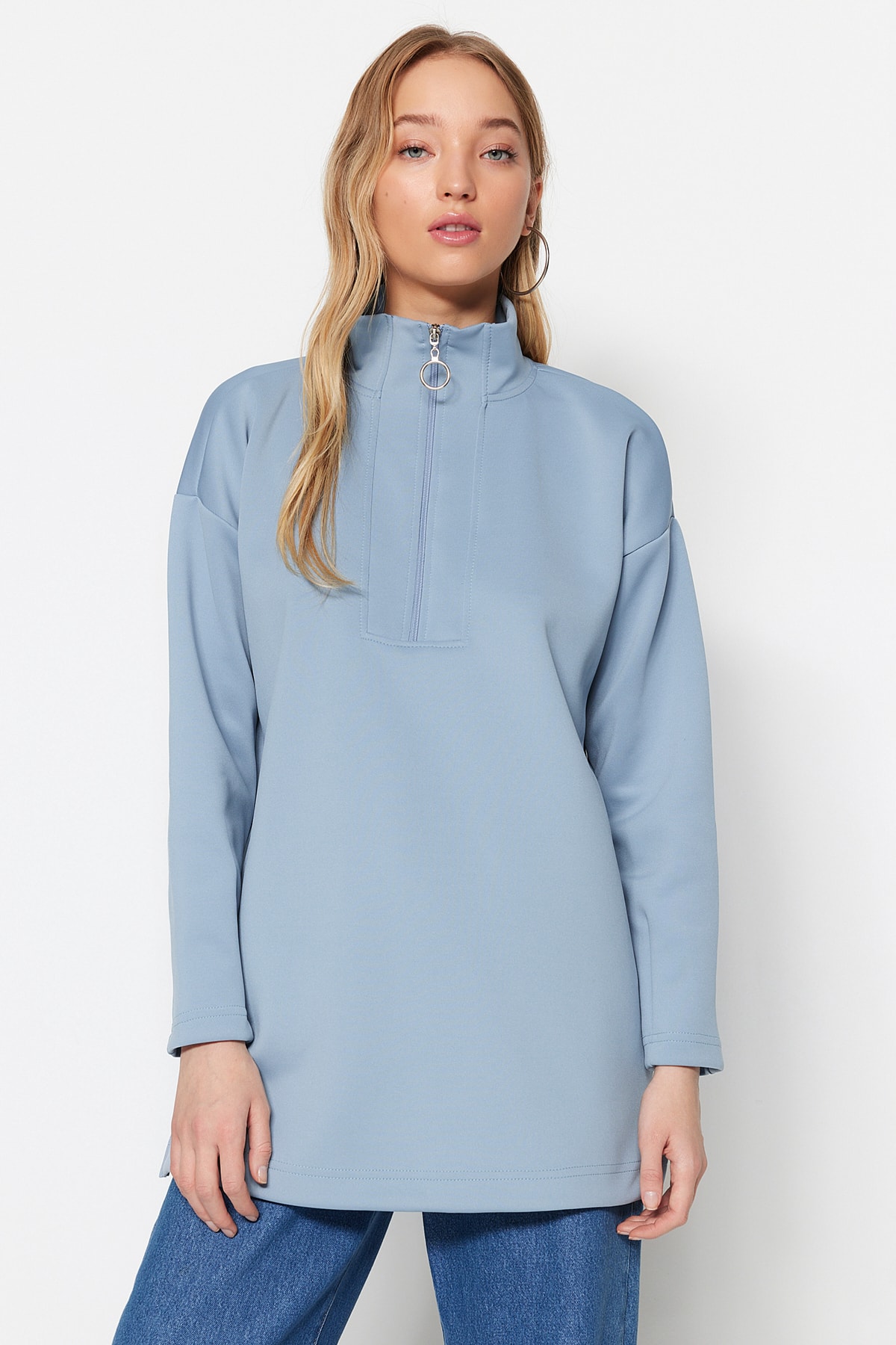 Niebieska, oversize'owa bluza z zamkiem błyskawicznym, z nadrukiem nurka/nurka, dzianinowa, TCTAW23TW00198 Trendyol Modest – cechy produktów