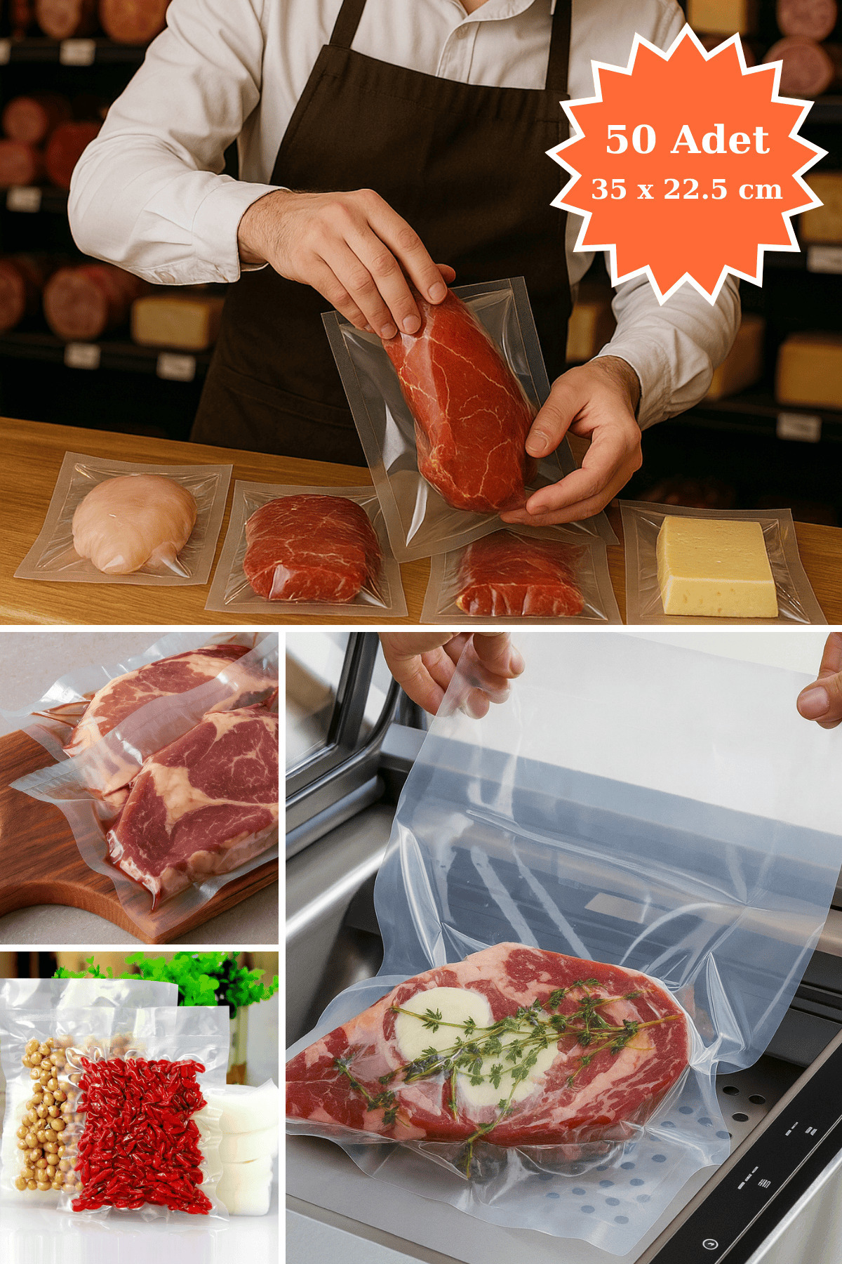 PlasandPlus Endüstriyel Vakum Poşet Torba Et Tavuk Peynir Gıdayla Temasa Uygun 155 Mikron Düz 35x22,5 cm 50 Adet Özellikleri