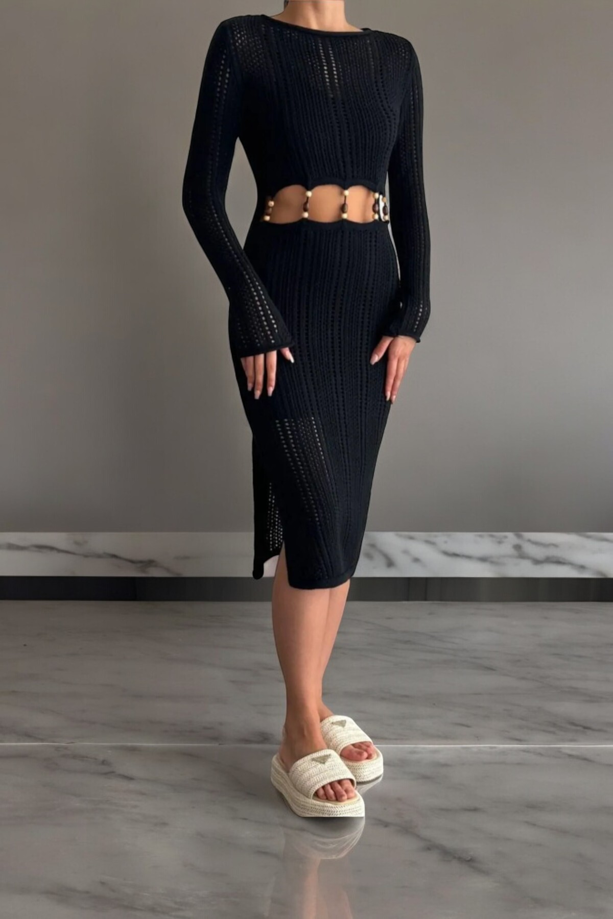 Pointmod Ketta Örme Bej Triko Bel Aksesuarlı Elbise Özellikleri