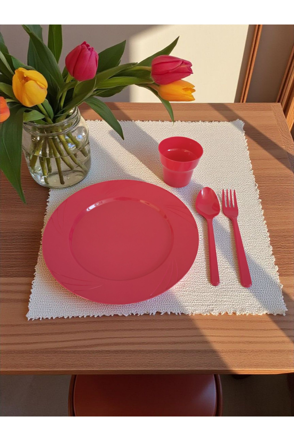 Pointpack Fuşya Kaliteli Sert Plastik Tabak Kaşık Çatal Bardak Seti 6 Kişilik