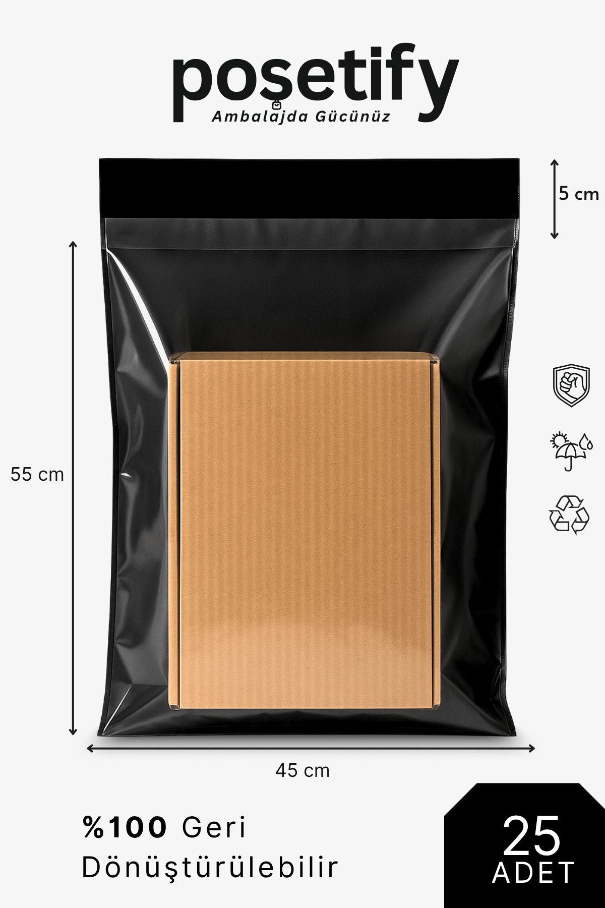 POŞETİFY Tek Tarafı Şeffaf Kargo Poşeti 45X55X5 cm | 25 Adet | Siyah | Yapışkan Bantlı E-Ticaret Poşeti Özellikleri