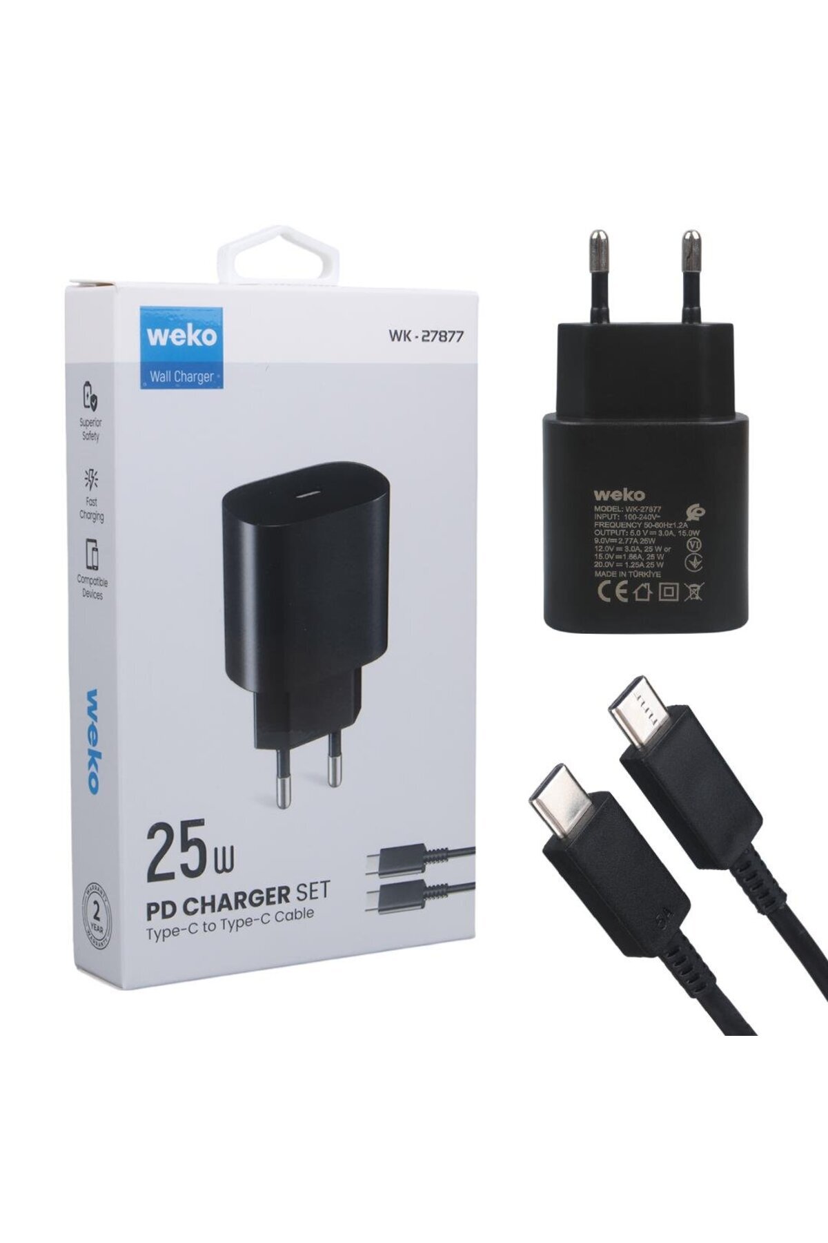 Powermaster Weko WK-27877 Note10 Siyah 25 Watt Şarj Başlık Adaptörü + Type-C To Type-C Kablo Özellikleri