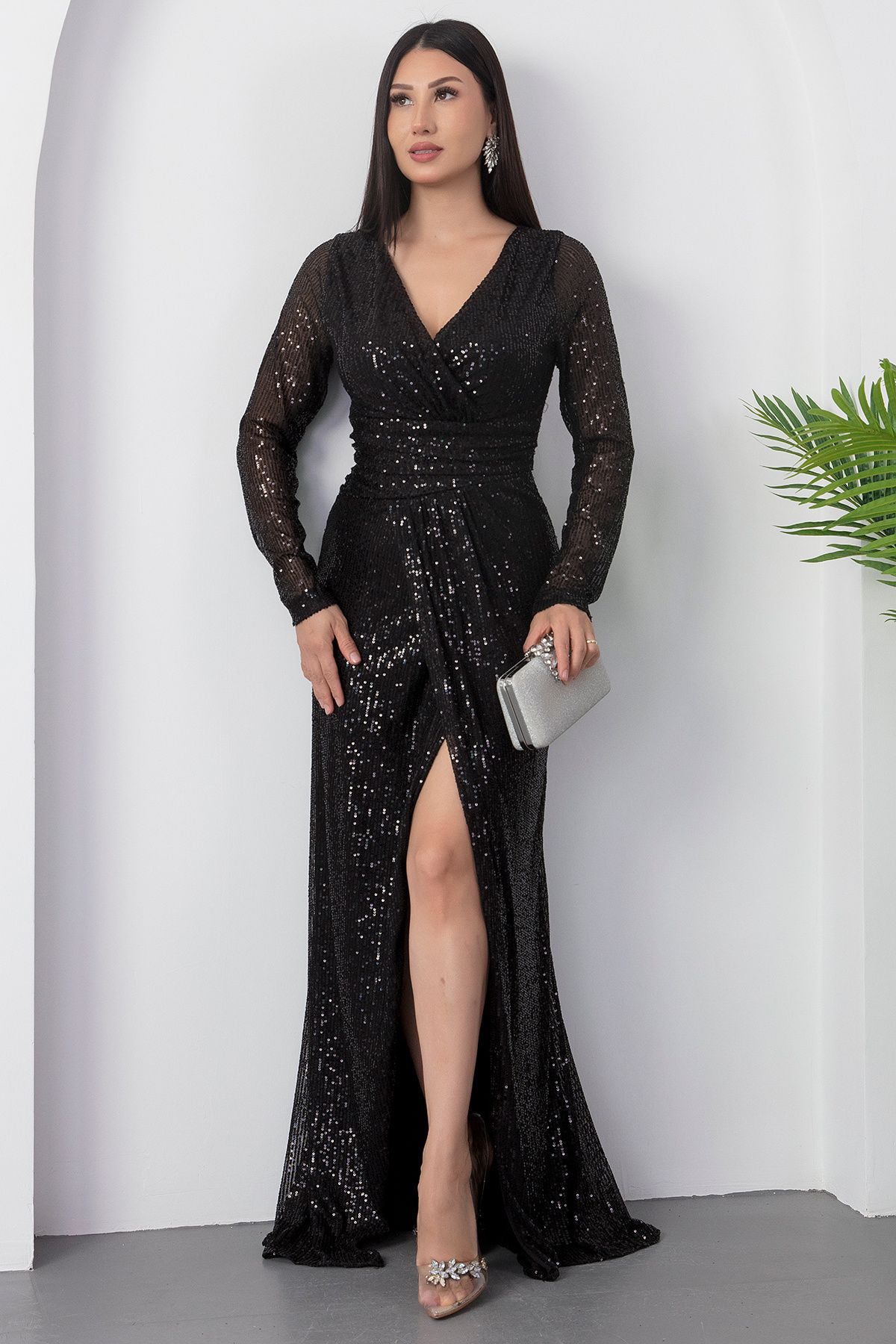 PULLIMM Kruvaze Yaka Uzun Kol Yırtmaçlı Pulpayet Elbise AP-3030 Özellikleri