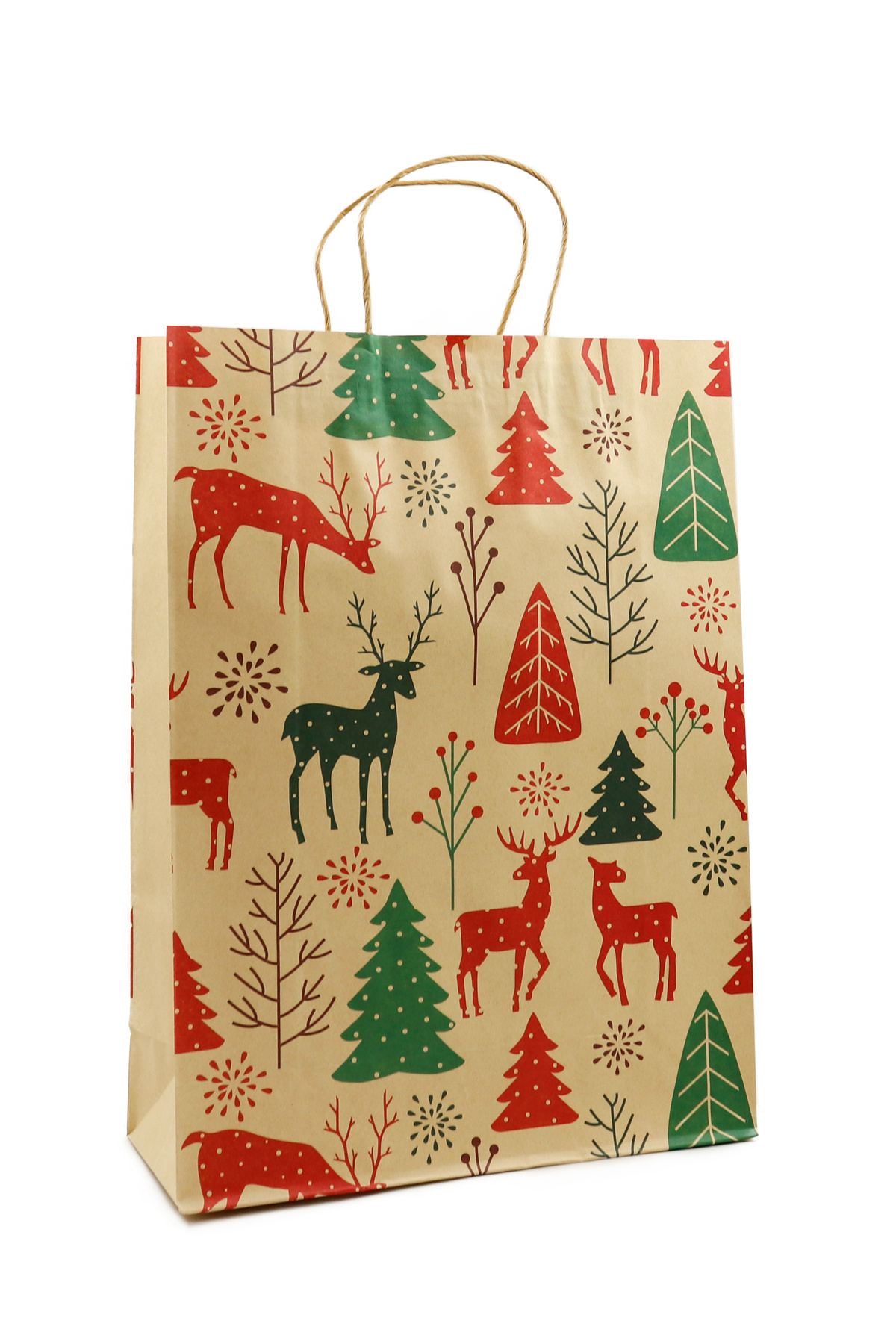 repro design 31x42 Yılbaşı Temalı Kraft Kağıt Poşet 2 Adet ( Çam Agacı ve Geyik Desenli )