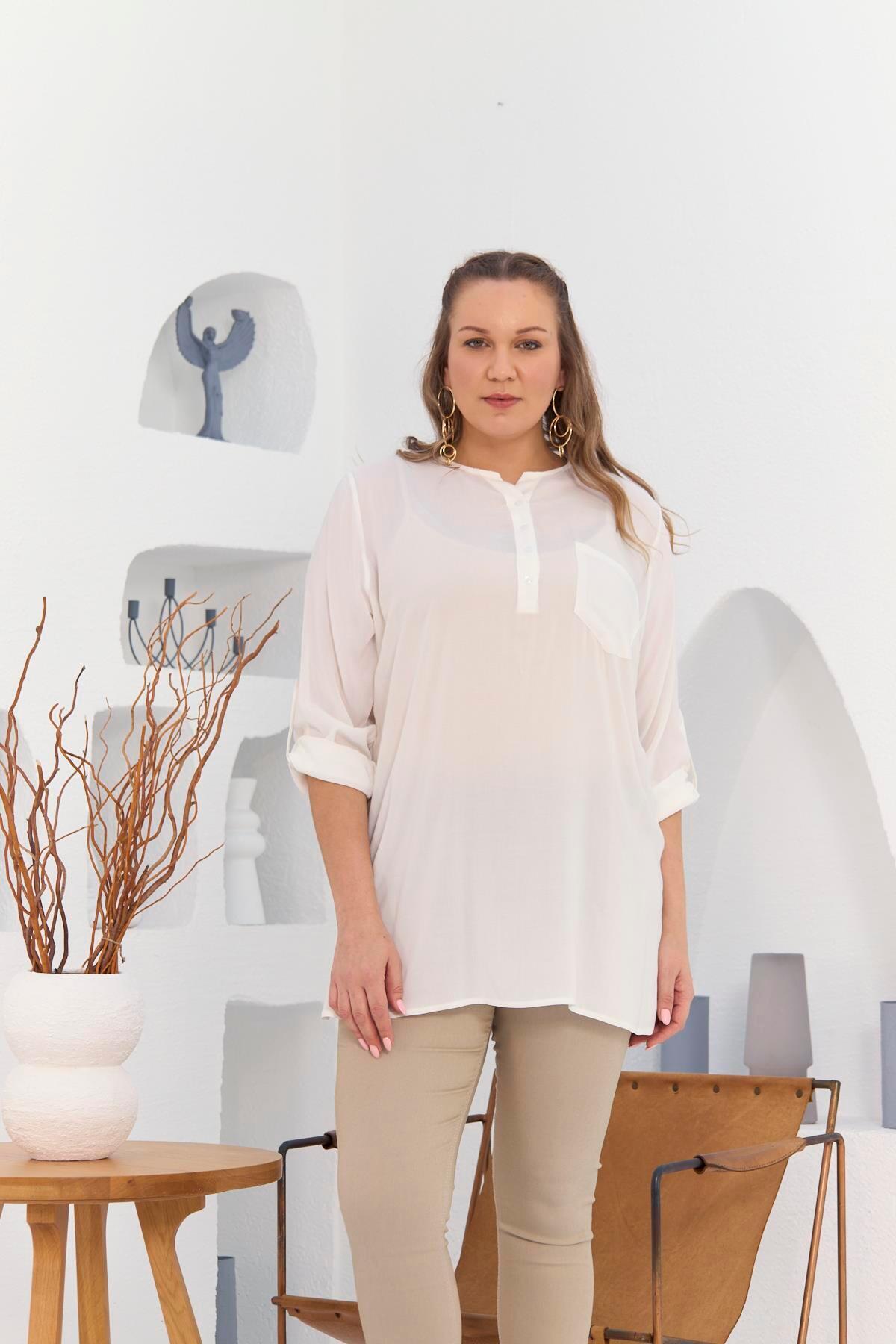 Rmg Cep Ve Kol Detaylı Vual Viskon Yırtmaçlı Büyük Beden Ekru Tunik