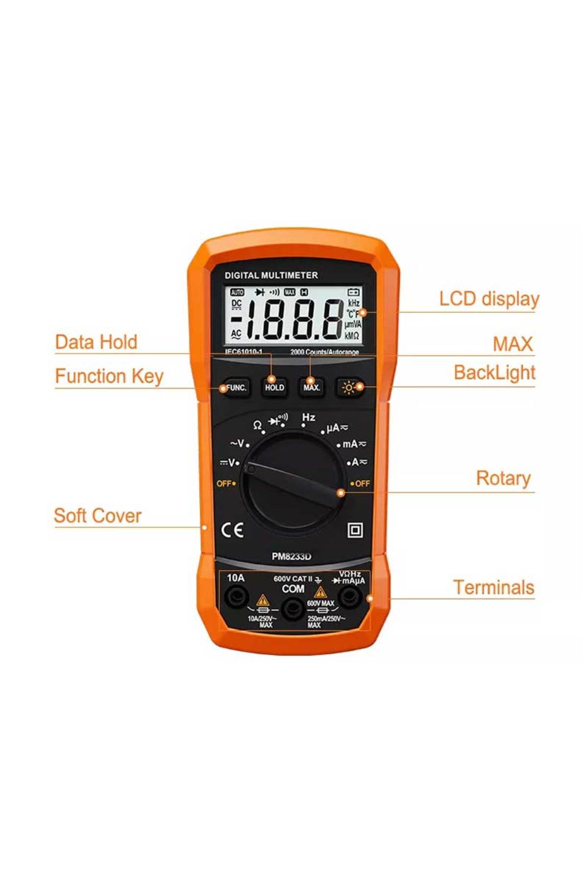 Auto range, Data hold, Back light, Diode test, Continuity, Maximum Value hold