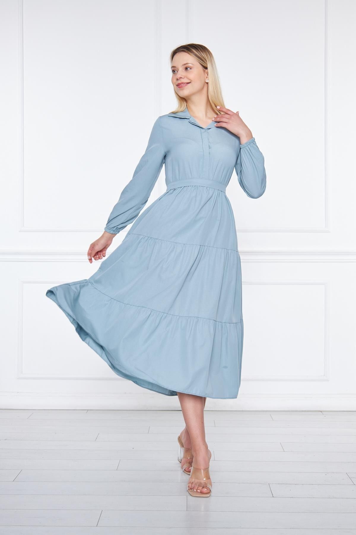 Caracteristici comstar Rochie lungă, elegantă, mentă, cu guler de cămașă