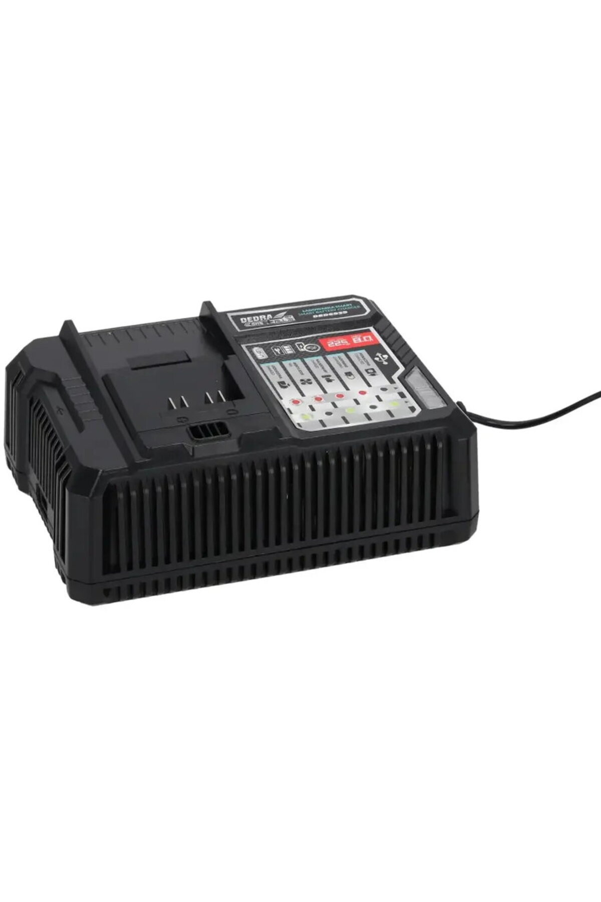 Fast charging, battery information system with LED indicators, built-in fan to cool the battery during charging