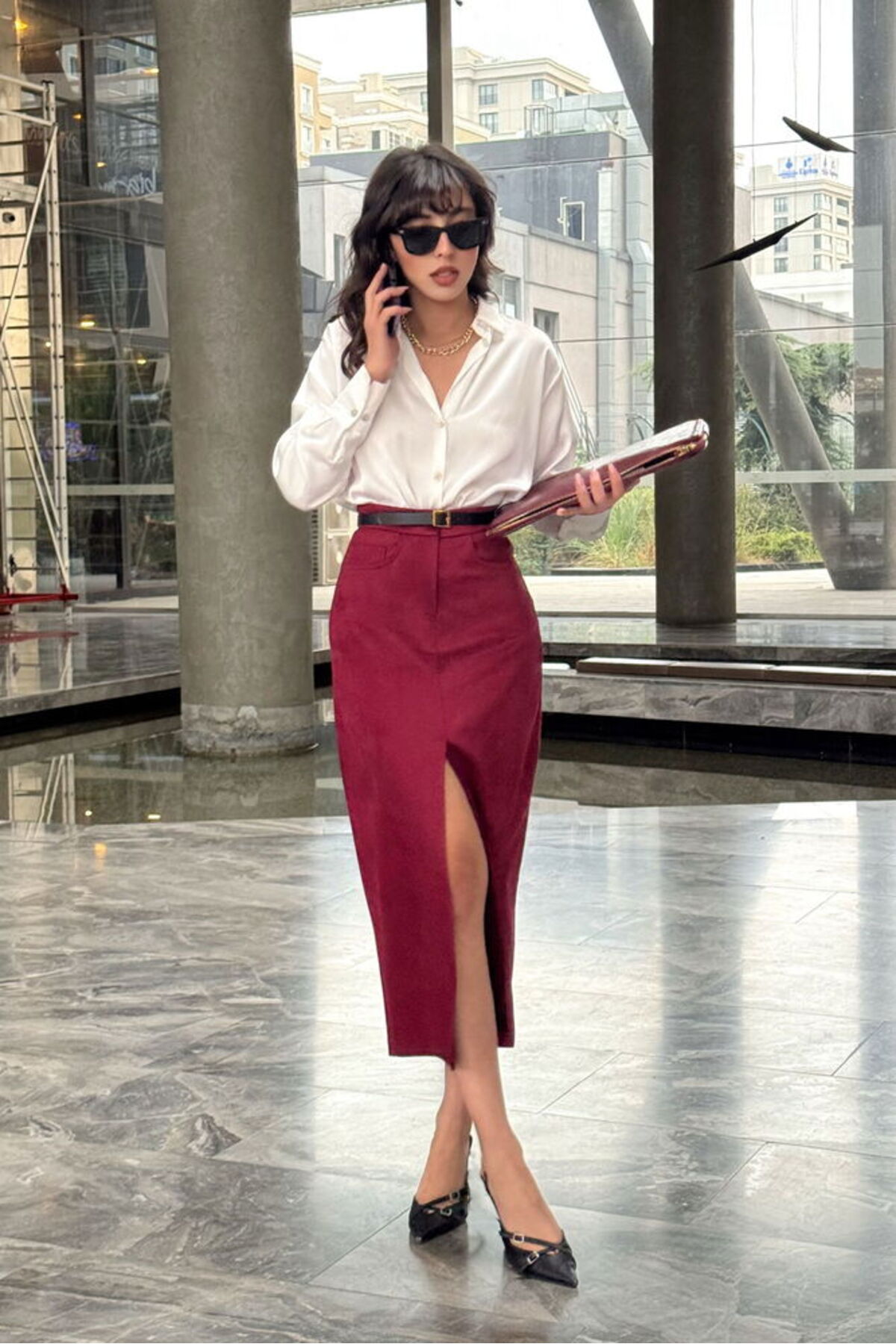 Caracteristici Lady Pixie Fusta midi cu detaliu din piele intoarsa