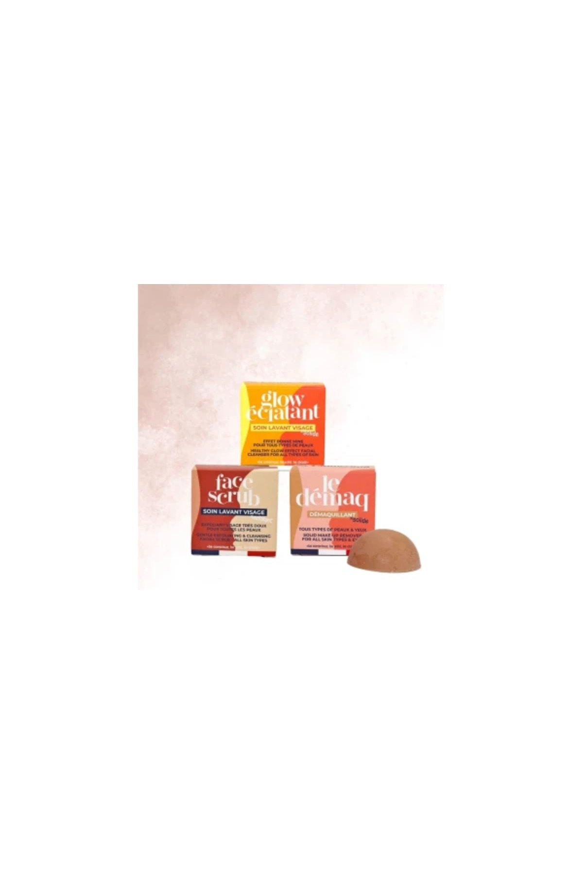Solid facial exfoliant: Suitable for all skin types; not for use on irritated or damaged skin. Glow Éclatant solid facial cleanser: Contains carrot macerate — not recommended for pregnant women.