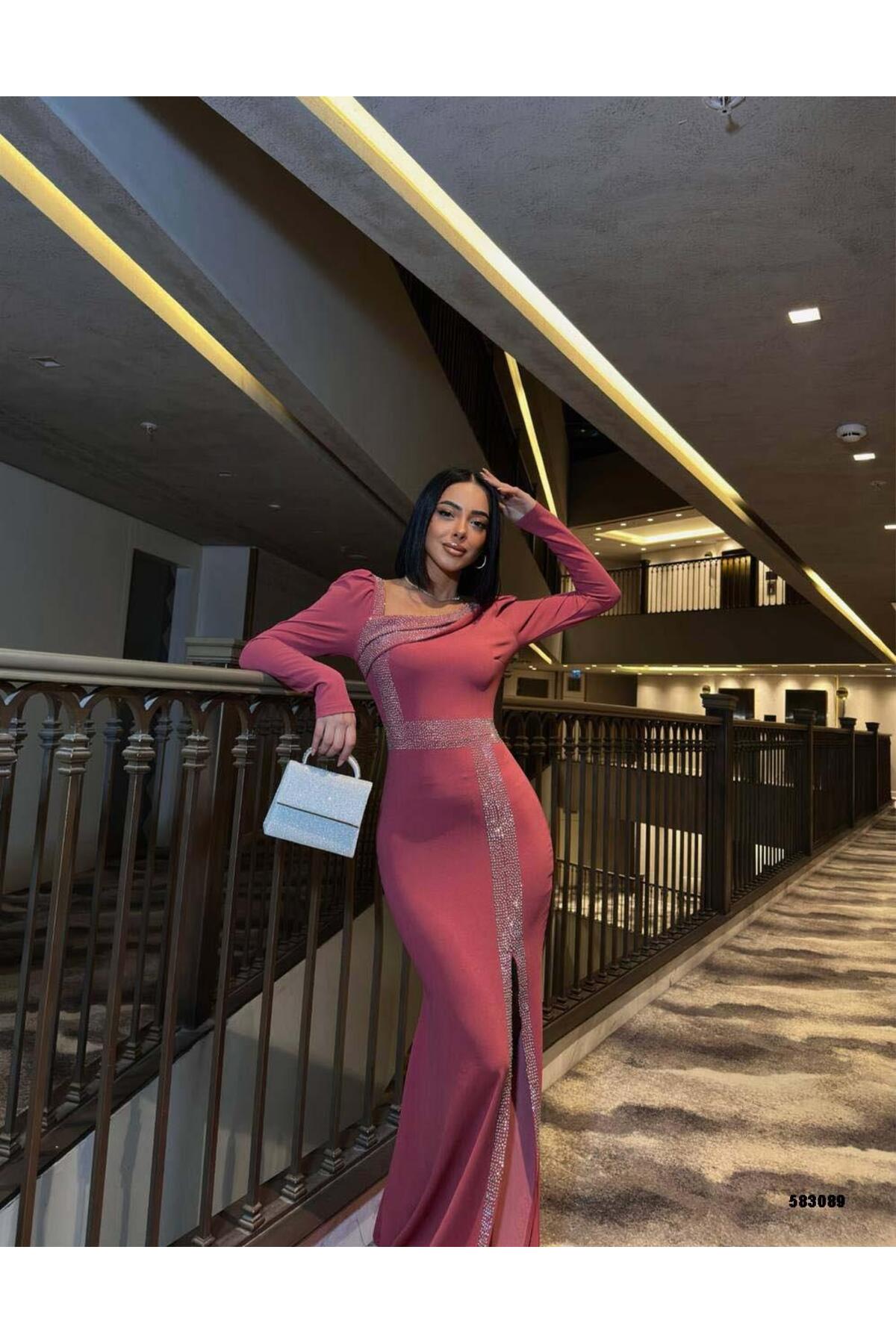 Modafeminen cu pietre aplicate rochie lungă de seară 583089 GÜLKURUSU