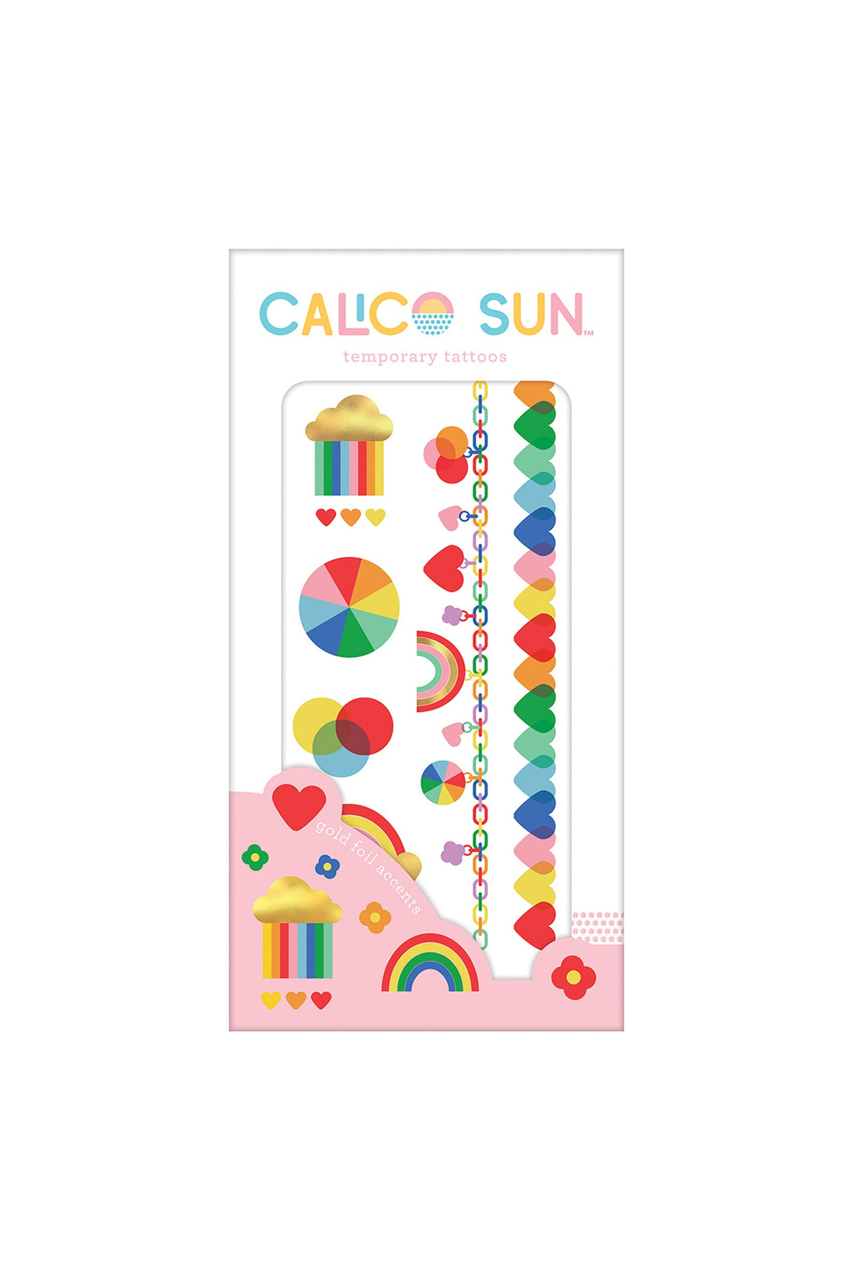 Include 2 foi de tatuaje temporare, Desenele prezintă curcubee, inimioare și o varietate de forme, Au un tratament cu folie de aur, Pachetul măsoară 20.32 x 20.32 cm, Potrivit pentru vârsta de 3 ani în sus