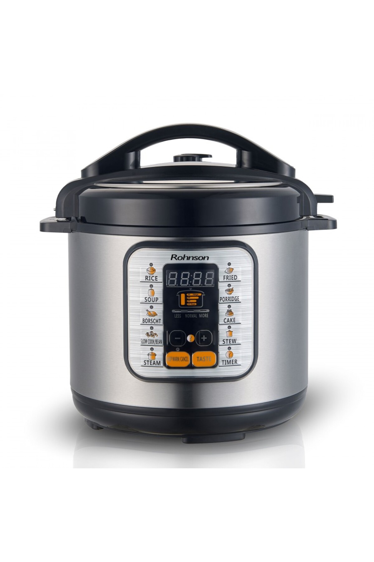 automatic pressure control, multiple safety features, adjustable pressure levels, a vertical storage lid support, insulated handle, and overheat protection.