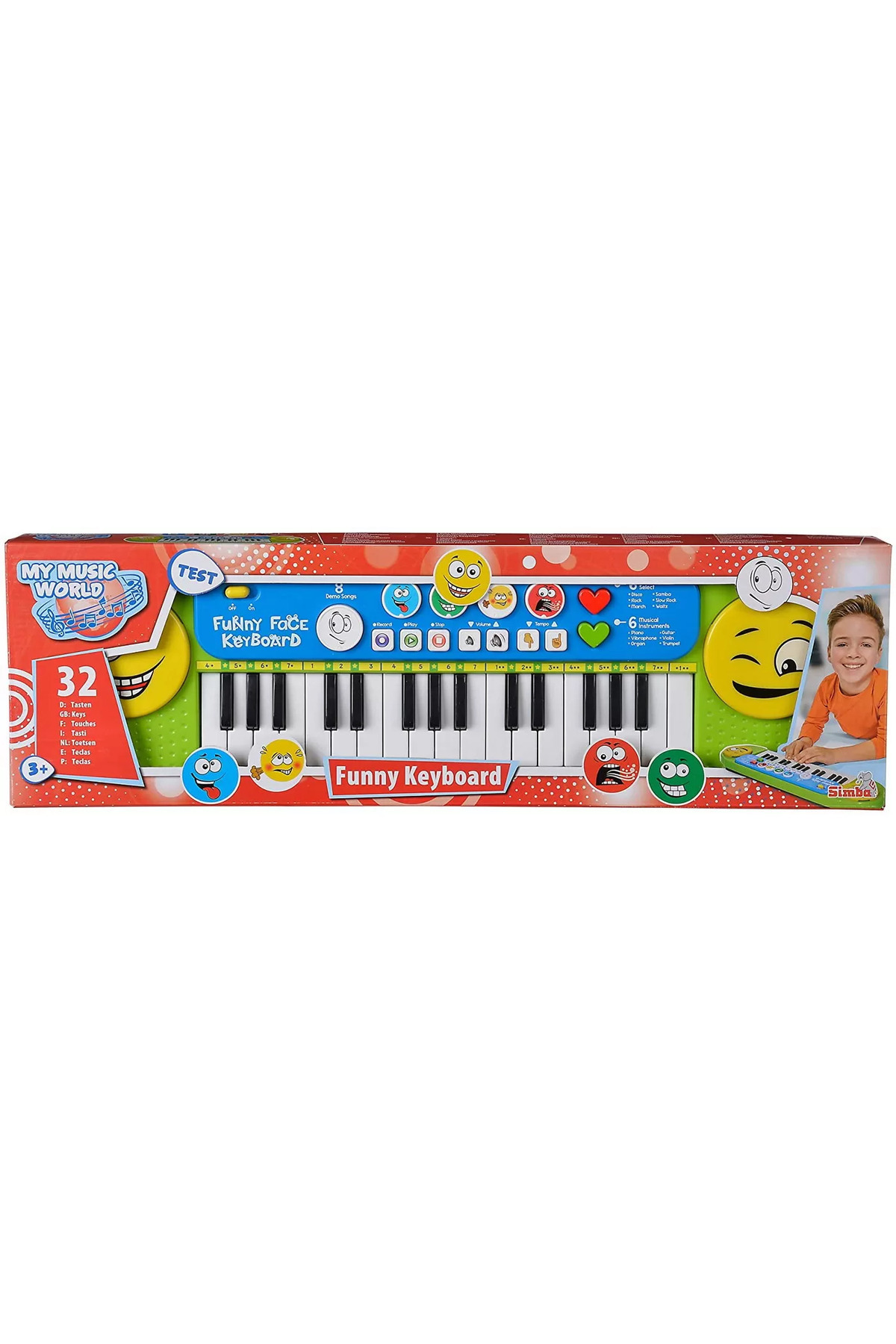 32 keys, 8 musical demonstrations, 6 rhythms, 4 funny noises