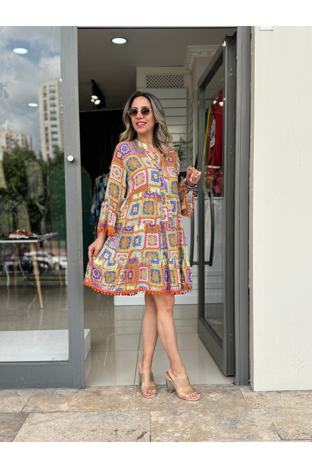 ROZELLA patchwork Kloş Elbise Turuncu Mini ELbise Özellikleri