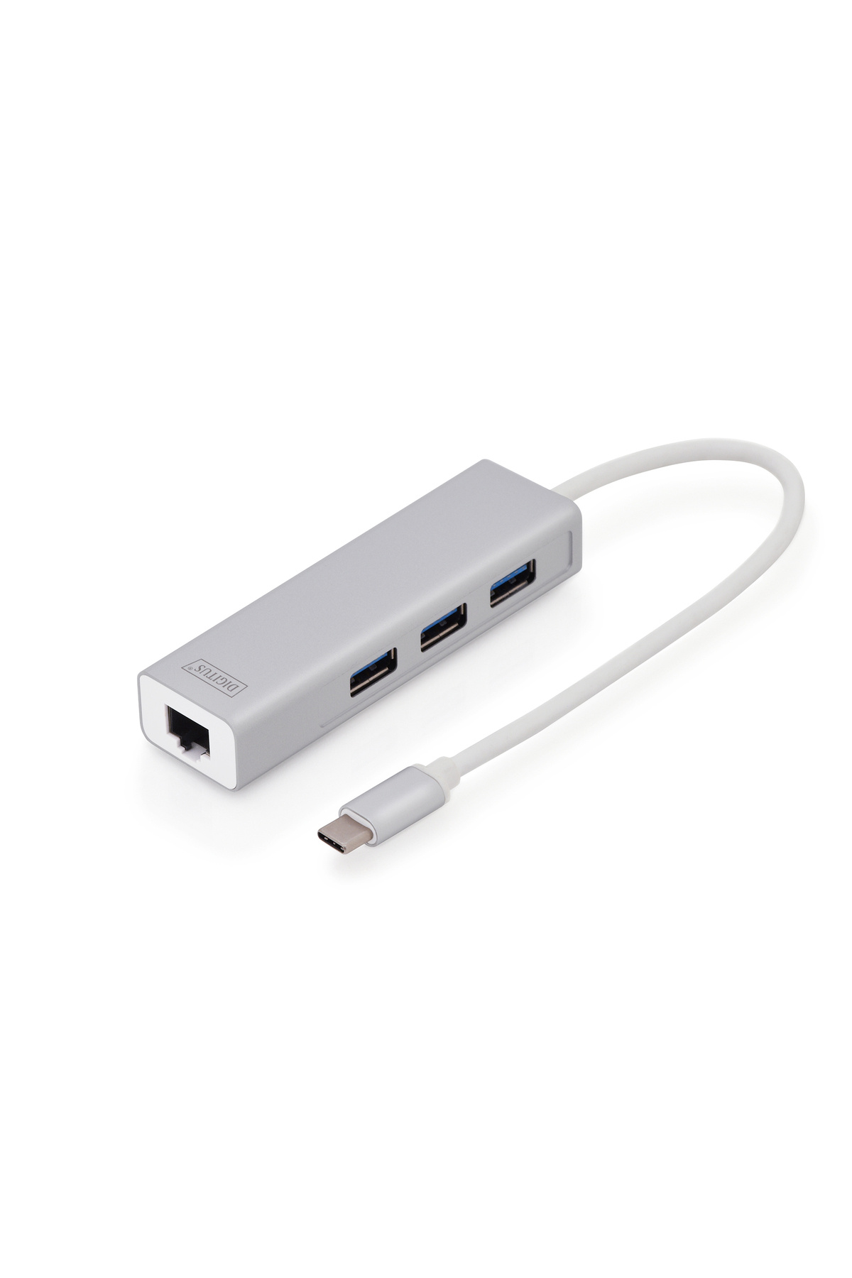 RuniqueHome Digitus USB 3.0 Hub & USB 3.0 Gigabit Ethernet Adaptörü, 1 x 10/100/1000 RJ45 Dişi Yuva, 1 x USB-C E