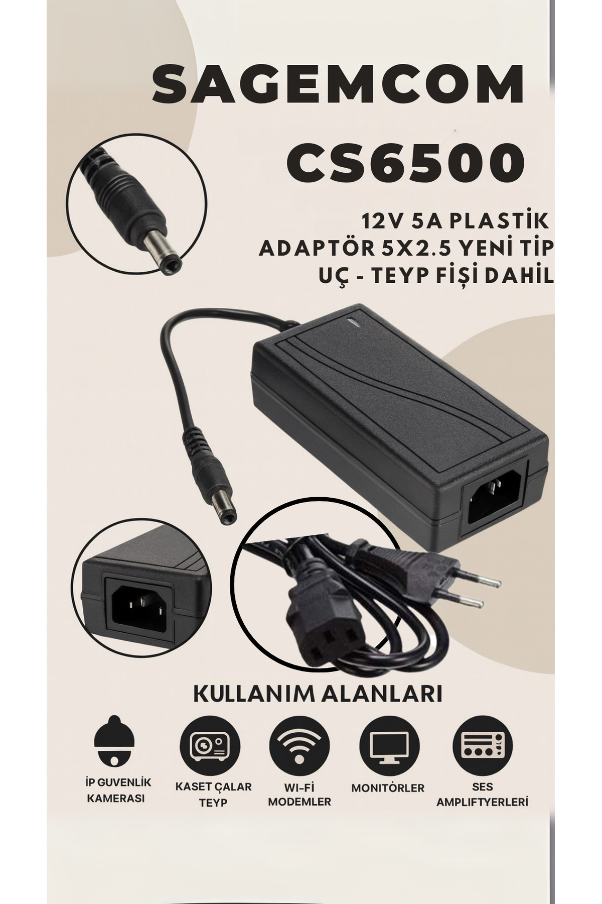 SAGEMCOM CS65001 12V 5A PLASTİK ADAPTÖR 5x2.5 YENİ TİP UÇ -TEYP FİŞİ DAHİL Özellikleri