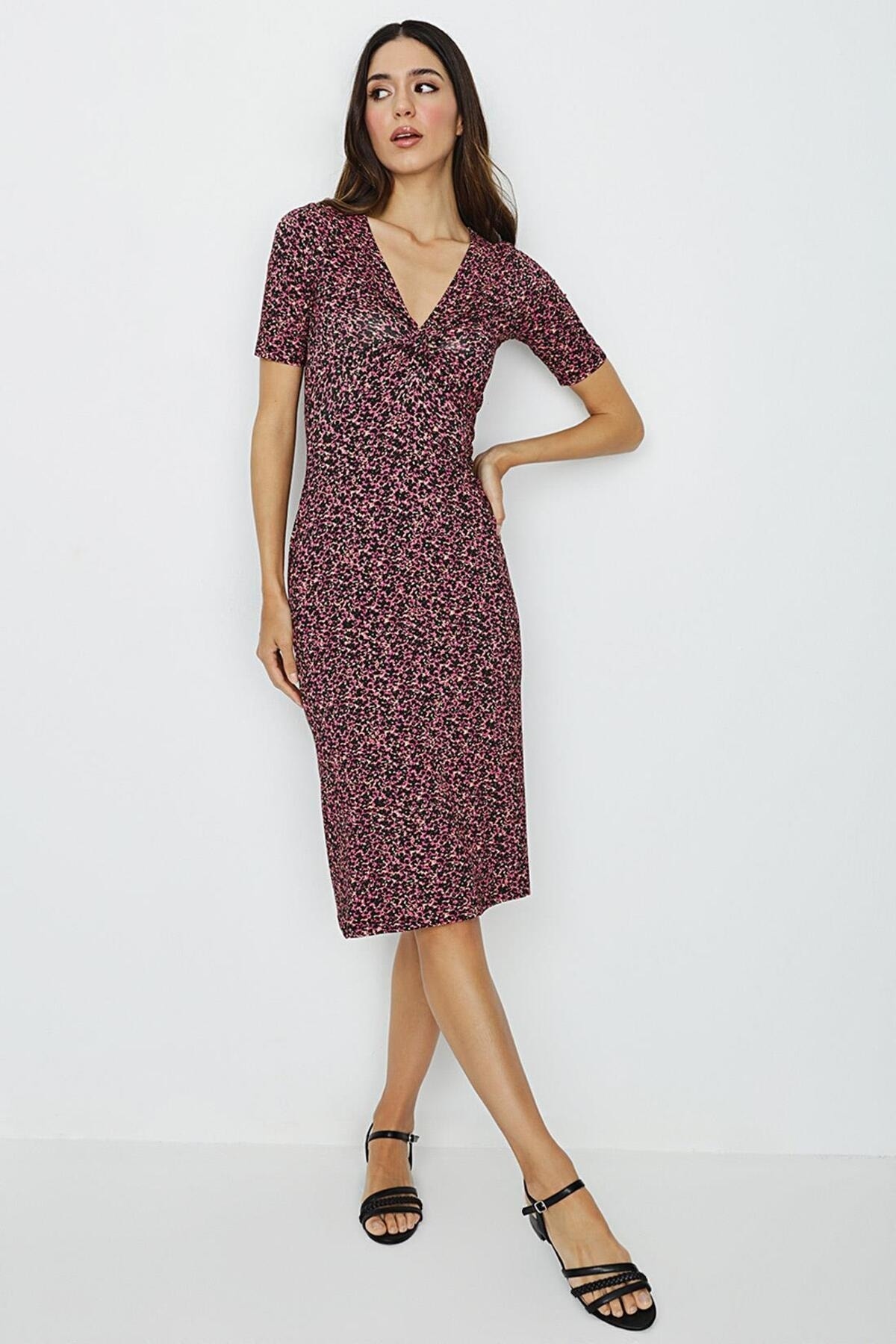 Select Moda Kadın Pembe Desenli V Yaka Örme Midi Elbise