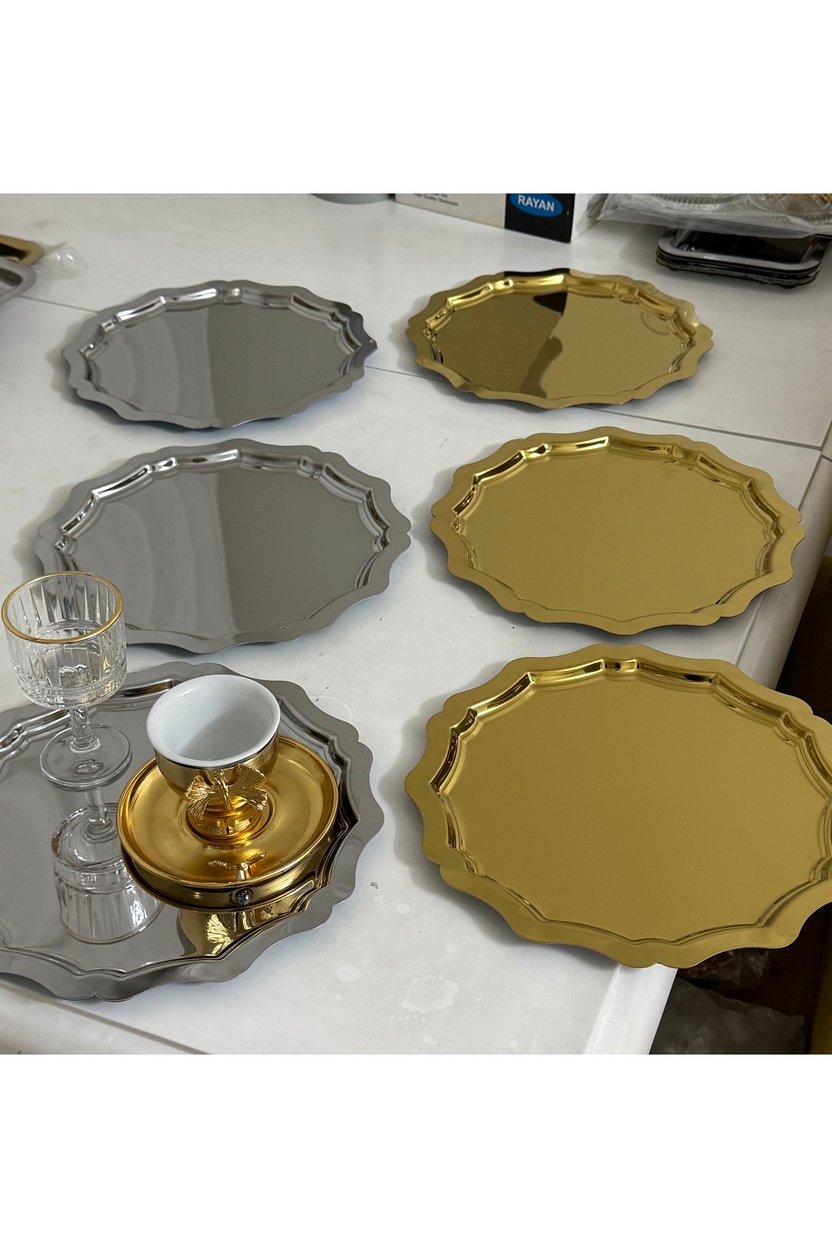 SEVA ÇELİK GOLD VE GÜMÜŞ YUVARLAK DALGALI 6 ADET SERVİS VE SUNUM TEPSİSİ
