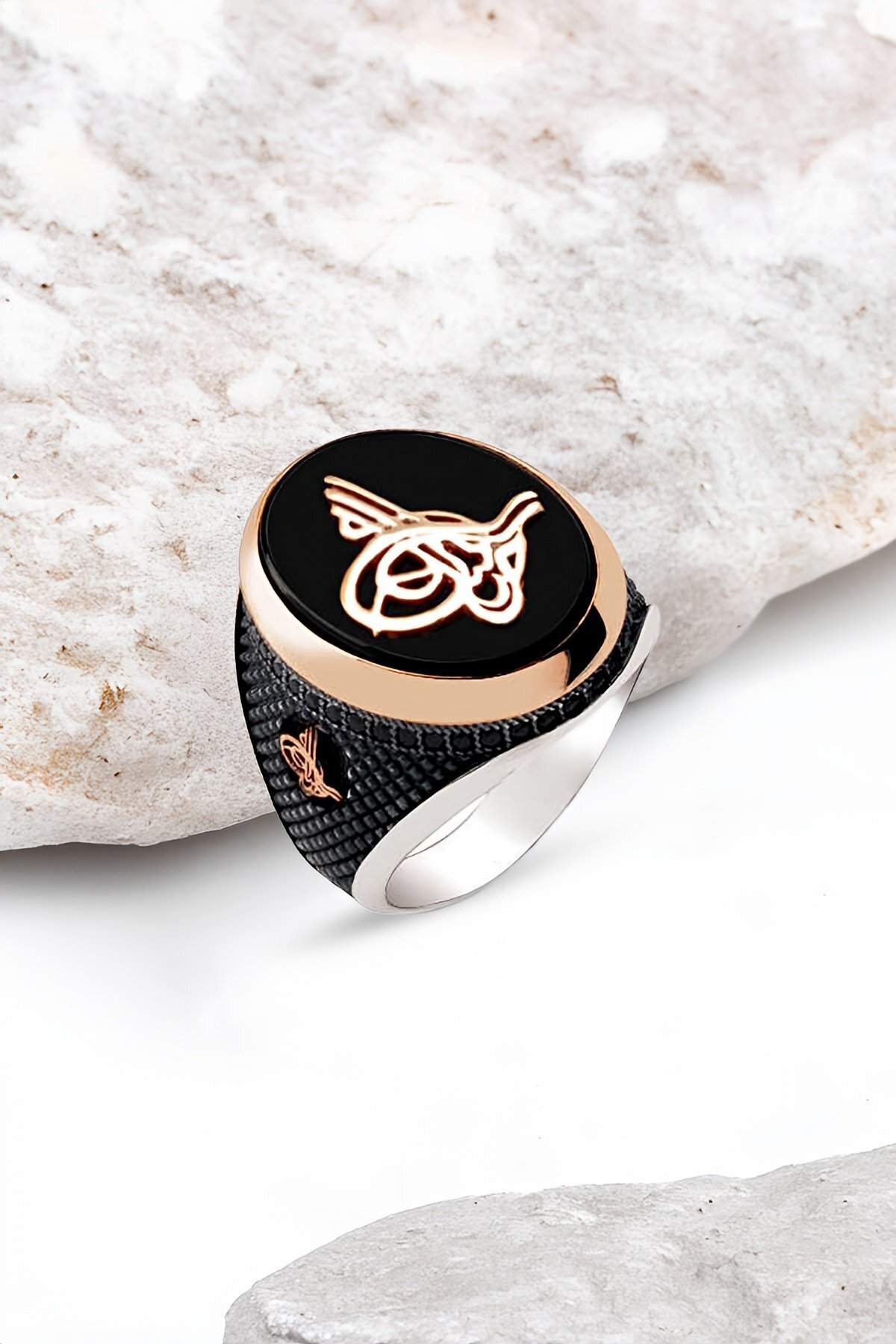 Silverplus Gümüş Siyah Onix Taşlı Osmanlı Tuğralı İşlemeli Erkek Yüzük