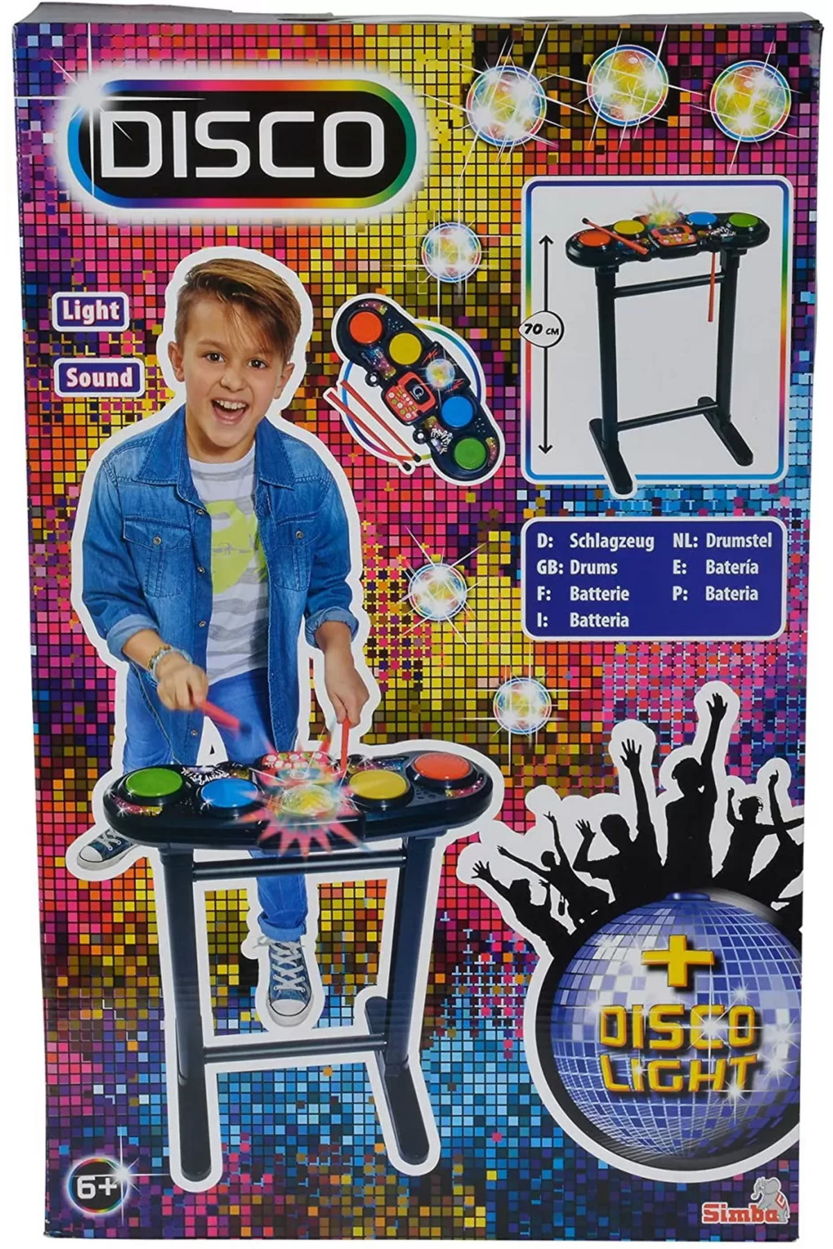 Includes two drumsticks, four drums, six rhythms, drum sounds, additional sounds, automatic stop, volume and tempo control, disco ball, and recording function.