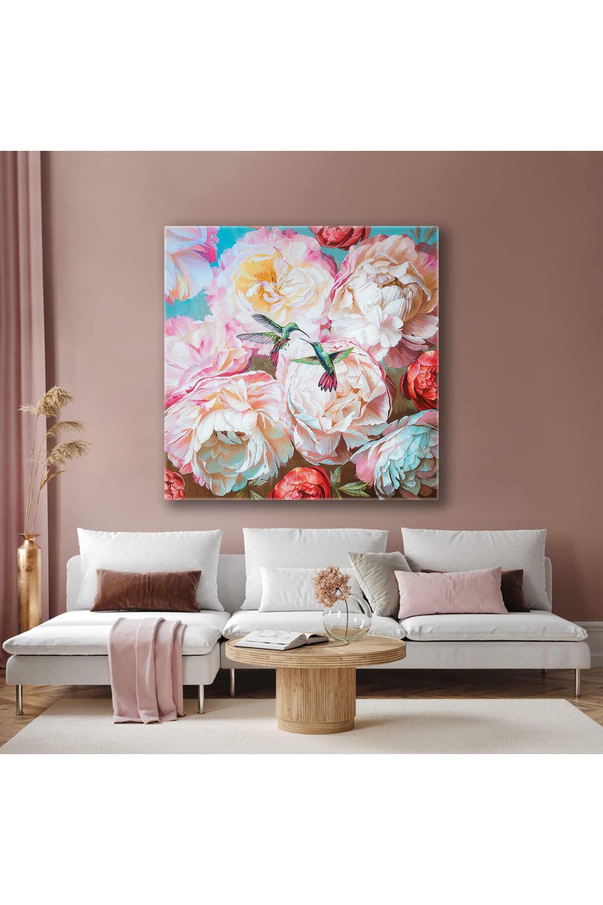 SML TABLO Beyaz ve Kırmızı Şakayık Çiçeği ile Sinek Kuşları Kare Kanvas Tablo Özellikleri