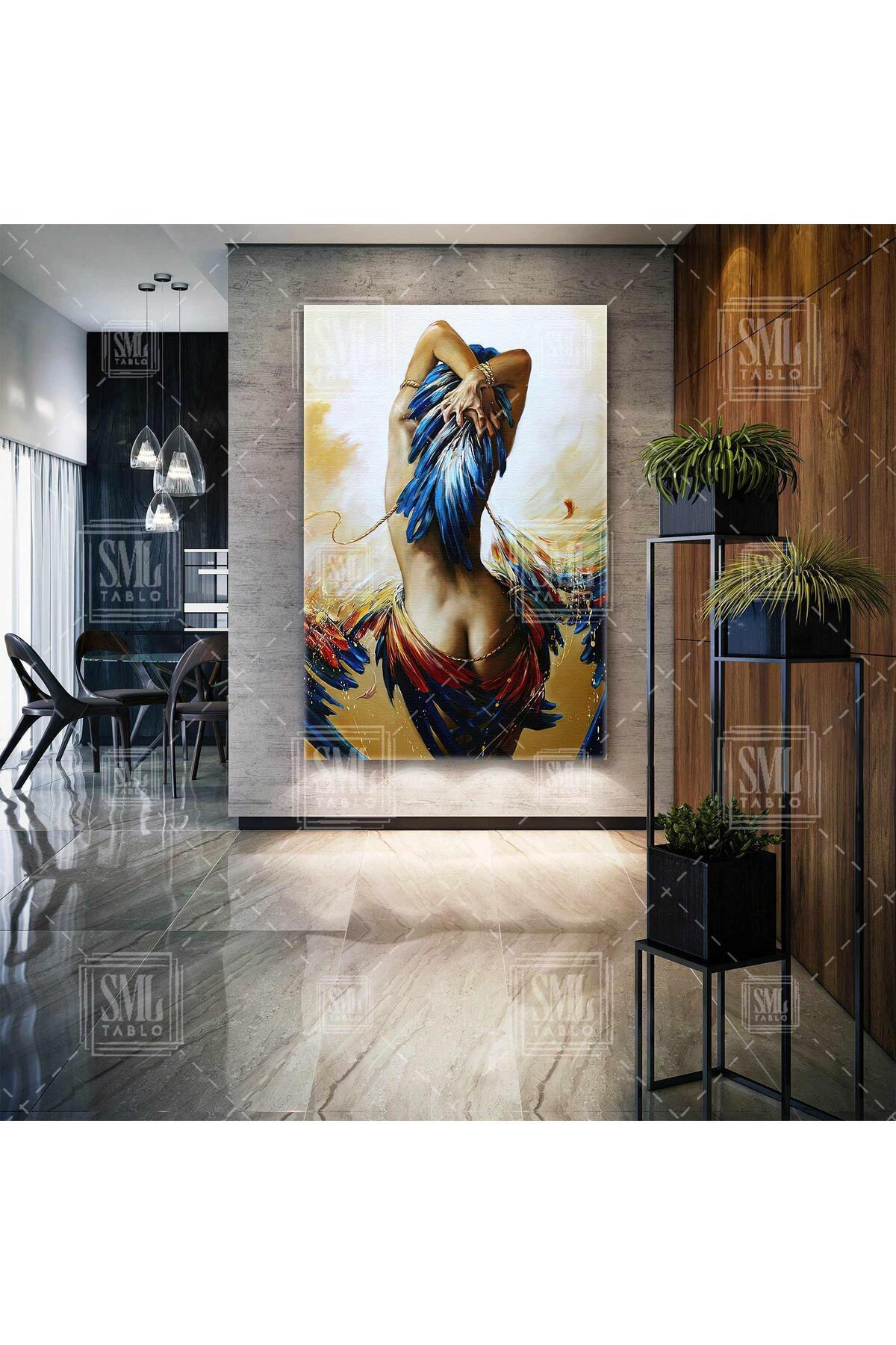SML TABLO Mavi Kuş Tüyü Saçlı Sırtı Dönük Çıplak Kadın Dikey Kanvas Tablo Özellikleri
