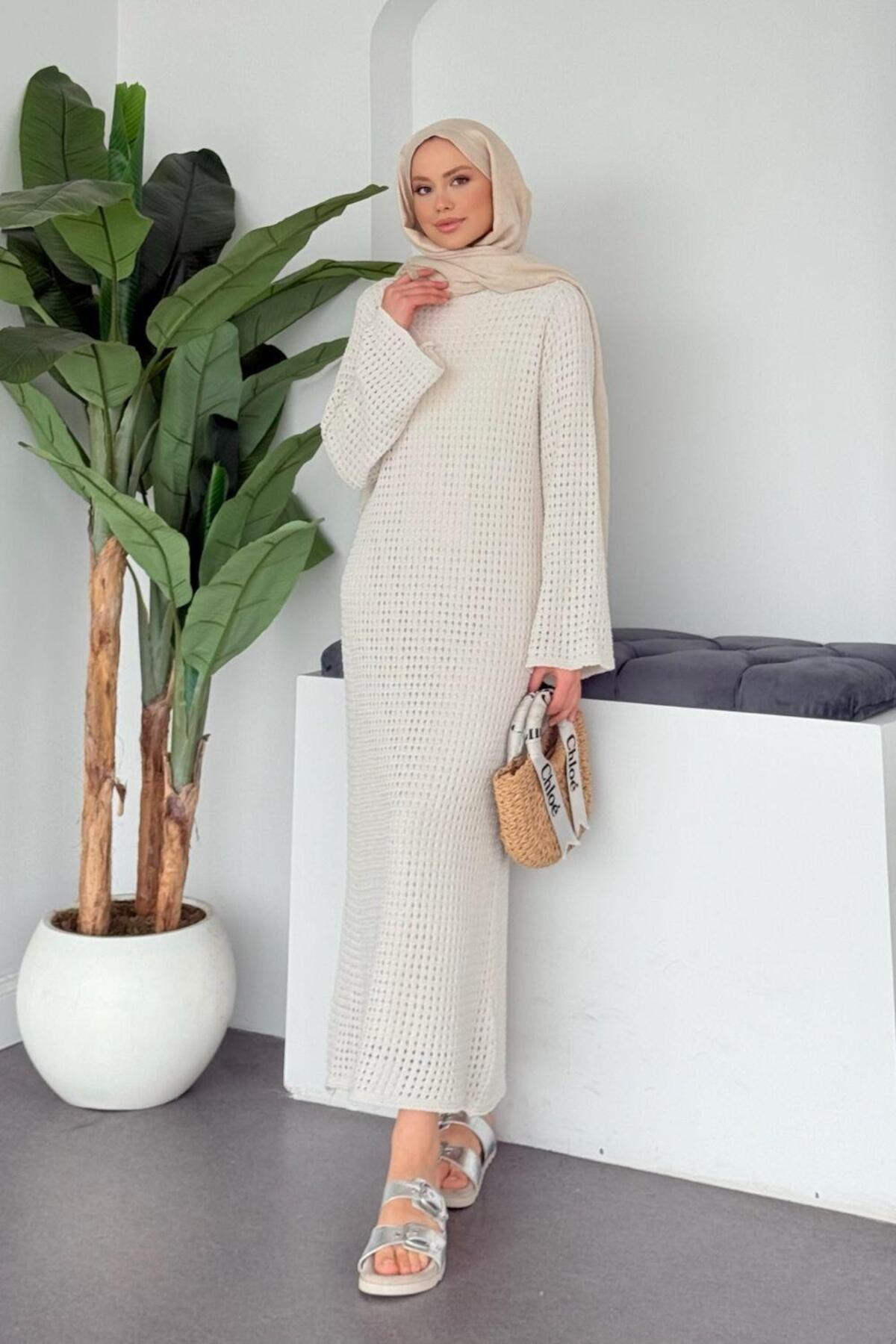 Şulemoda Giyim File Ajur Örme Elbise Ekru